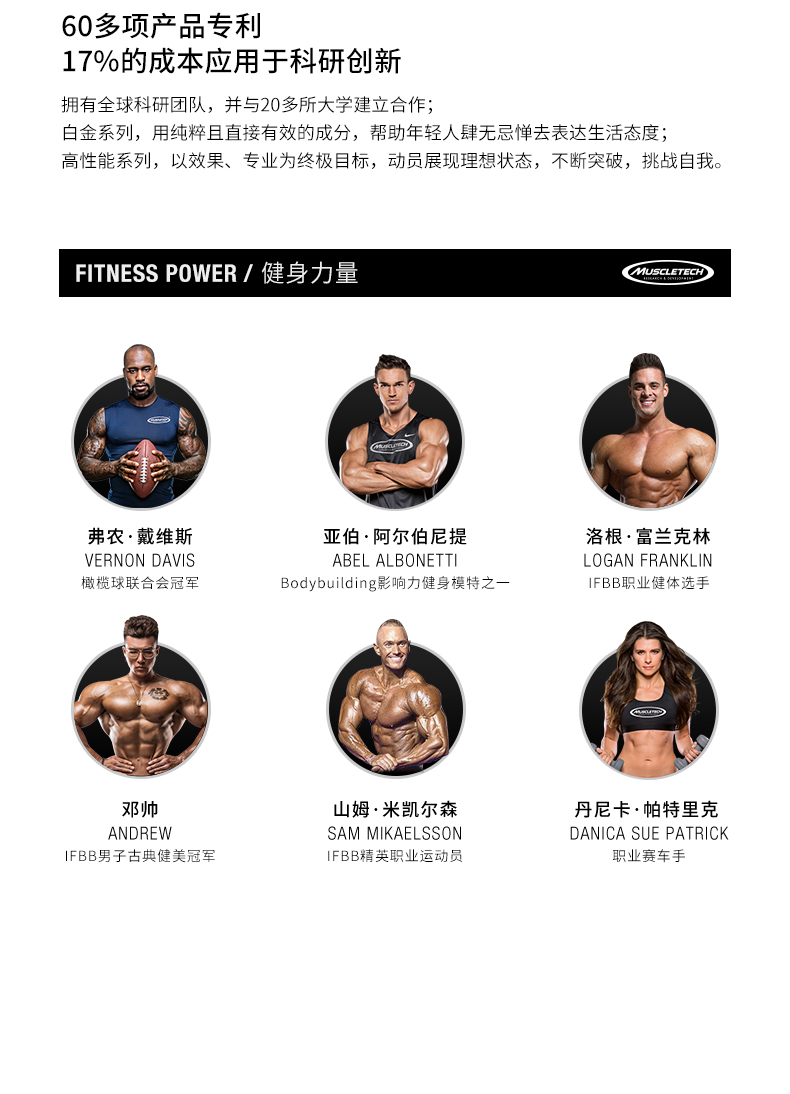 肌肉科技是美国最知名的运动营养品牌之一,品牌代言人包括了乔卡特,菲尔·希斯,德克斯特·杰克逊等历届奥林匹亚大赛冠军。在美国健身市场,肌肉科技代表最高品质的象征。肌肉科技旗下有高性能系列,黑金浓缩系列,特纯系列等,肌肉科技的减脂产品精英脂肪杀手系列(Hydroxycut)和正氮蛋白(Nitrotech)都多年在美国荣获该类别销量第一的称号。