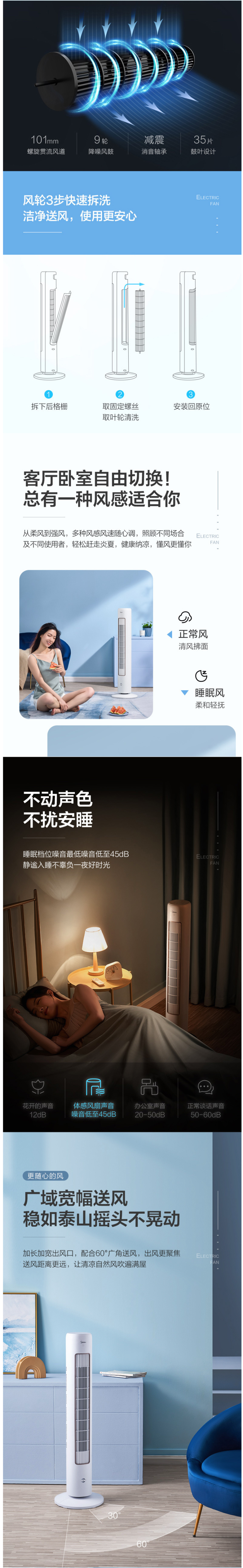 加长加宽出风口,配合60°广角送风,出风更聚焦送风距离更远。使用直流无刷电机,模拟自然风搅动室内空气,转速平稳,风质柔和更舒适。