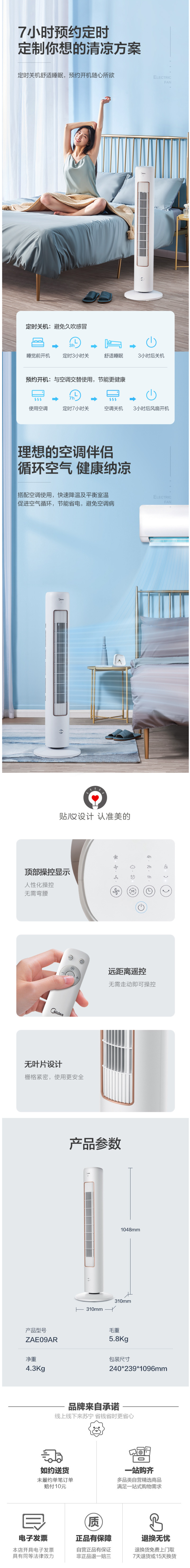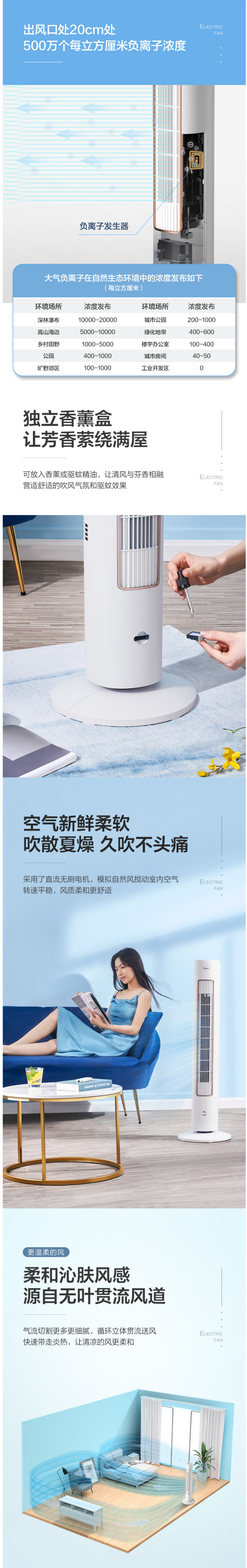 能远程遥控控制,可7小时预约定时,独立香薰盒,可放入香薰或驱蚊精油,清新空气和驱效果。高度1048mm,底盘直径310*310mm,比一张A4纸都略小,节省空间不占地方。