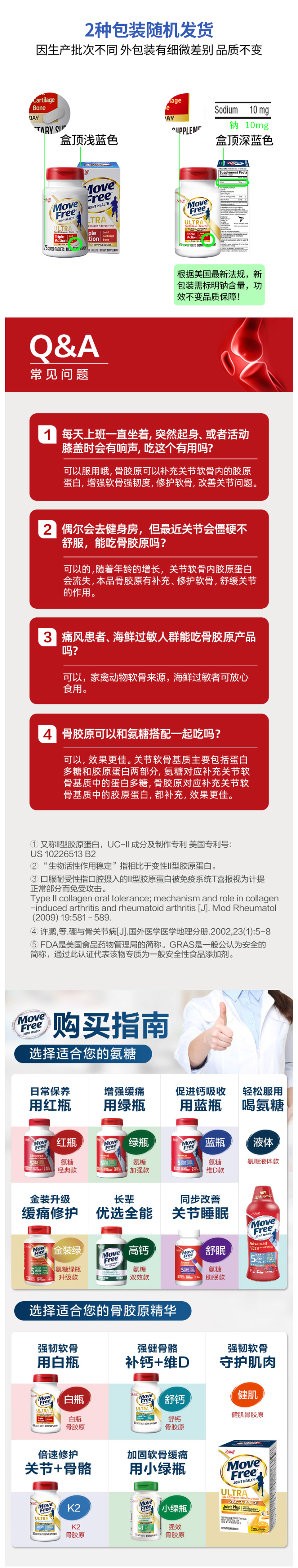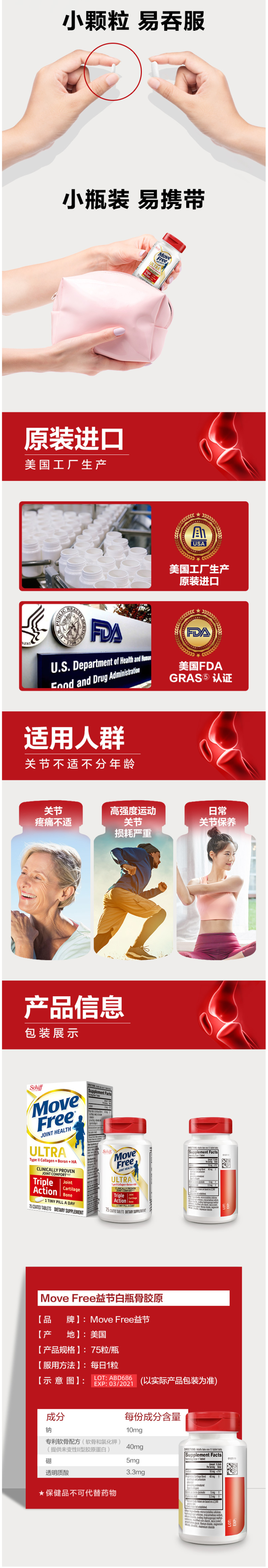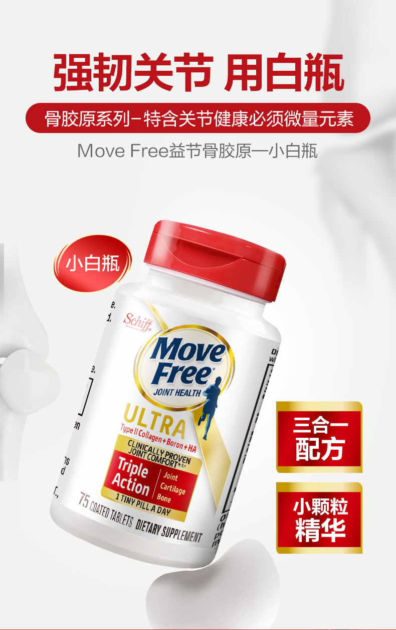 Move Free系列中除了大家熟悉的红、绿、蓝三种普通款,还有这款Move Free Ultra,更新了新配方,不过主要配方和含量都没有变化。能保护关节,减轻关节磨损,修复流失软骨的重要成分,关节部位有较轻微病症的人群可以考虑服用。
