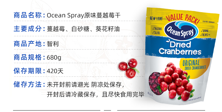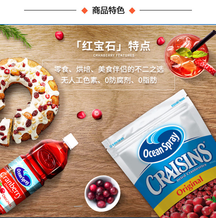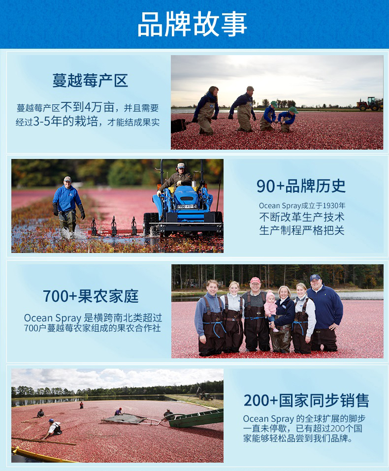优鲜沛(Oceanspray),是有着75年悠久历史的美国果汁饮料与食品产业巨头,是北美最大的罐装和瓶装果酱生产商,在整个北美地区拥有超过600个大型种植园,给全球各地的消费者提供最优质的产品。作为全球最大蔓越莓供应商,目前全世界超过60%的蔓越莓都来自优鲜沛(Ocean Spray)公司,