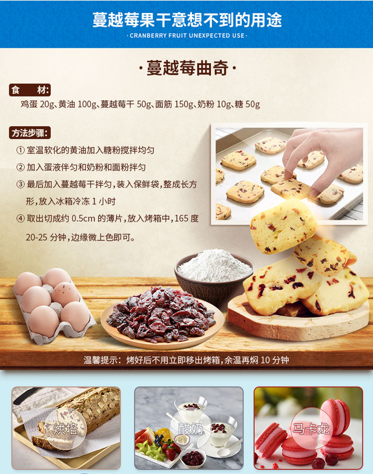 蔓越莓只适合栽种在高酸性沙土中,全球产区不到4万英亩,由于它对于人体健康,尤其女性健康保养有诸多好处,因此“小红莓”有“北美红宝石”之称。除了富含维生素C之外,还有许多营原元素,还有其他水果罕有的初花青素(PACs) ,既可以直接吃,也可以用来做烘焙、甜点等,老少皆宜。