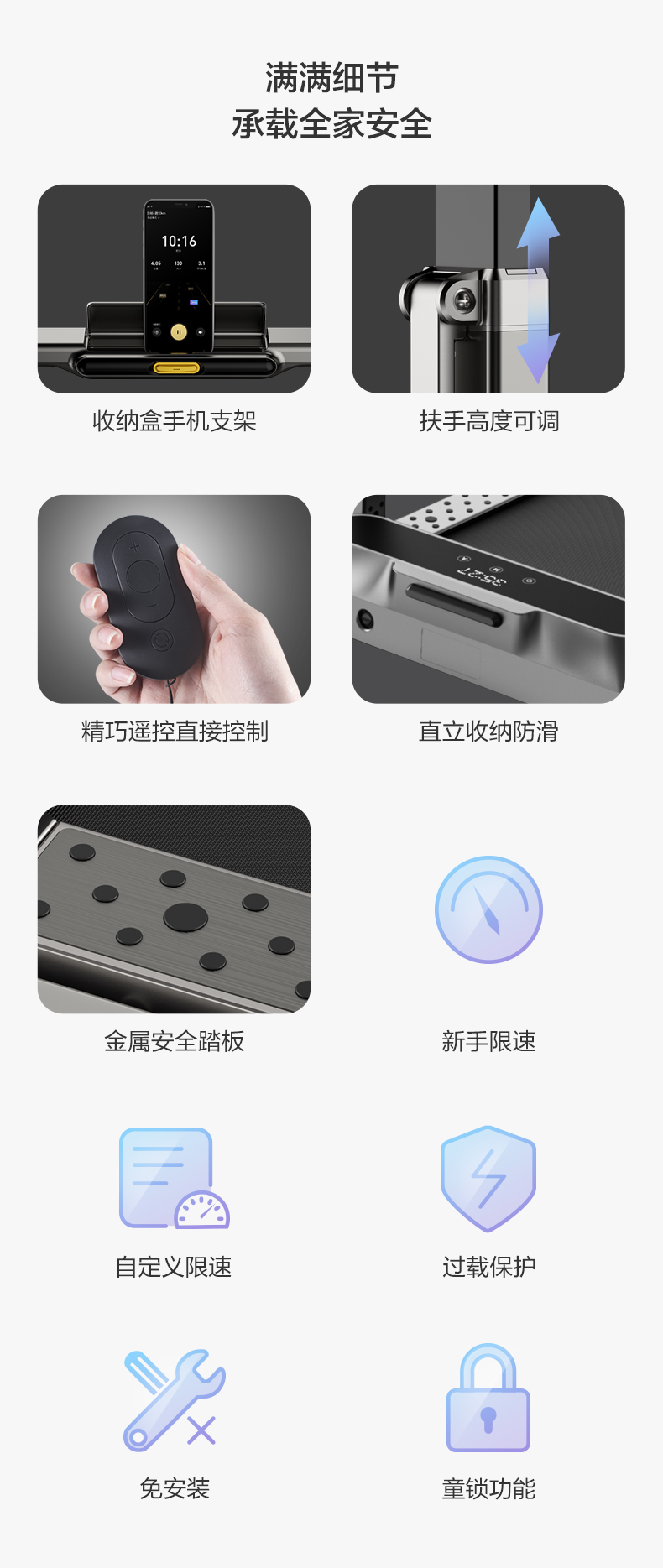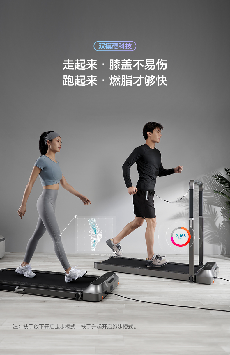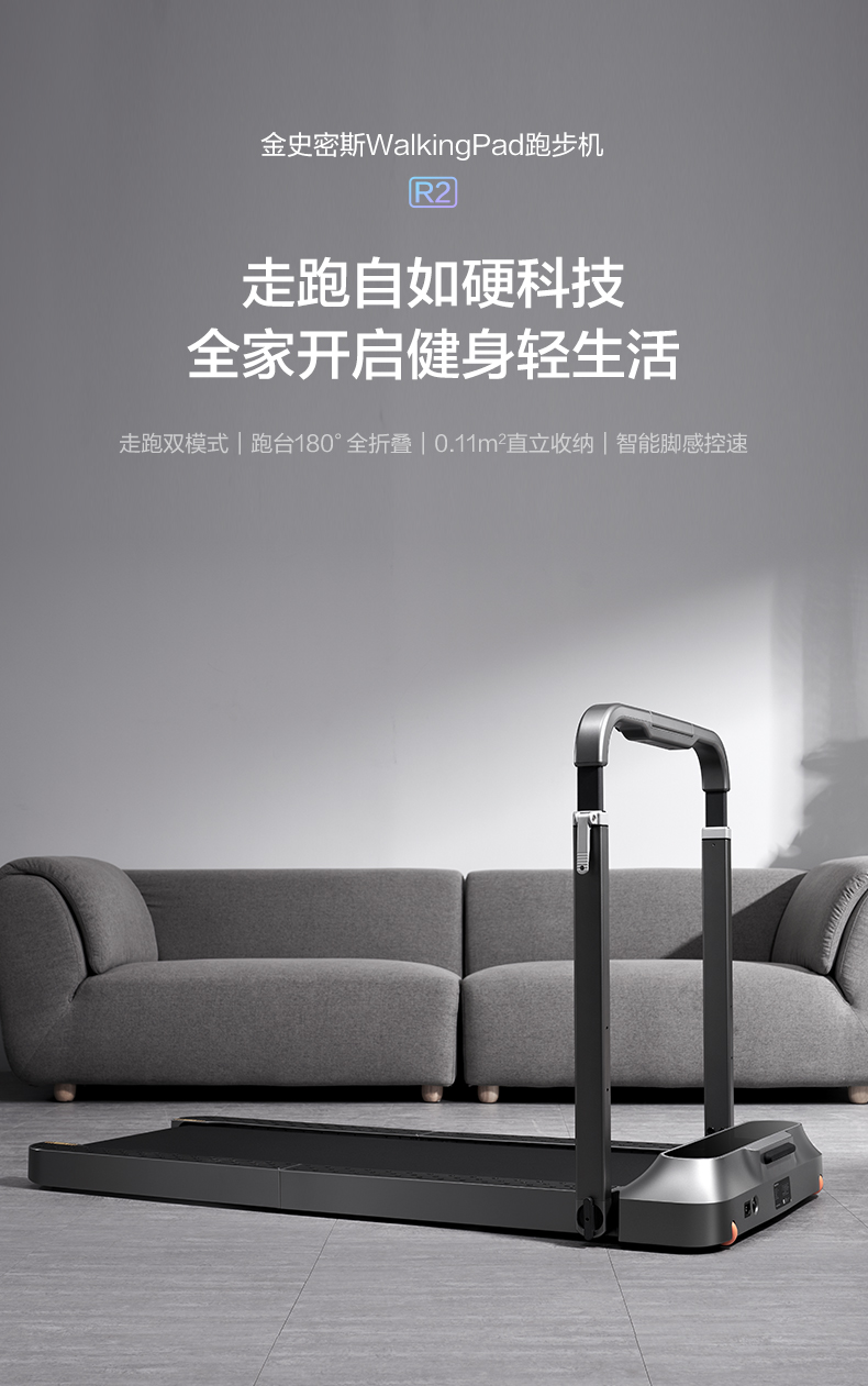 R2拥有两种的设计模式「跑步机」「走步机」。常规形态下是跑步机,可满足在家跑步的需求。将扶手向下持平收纳,即可变成走步机,非常方便,一机两用了。
