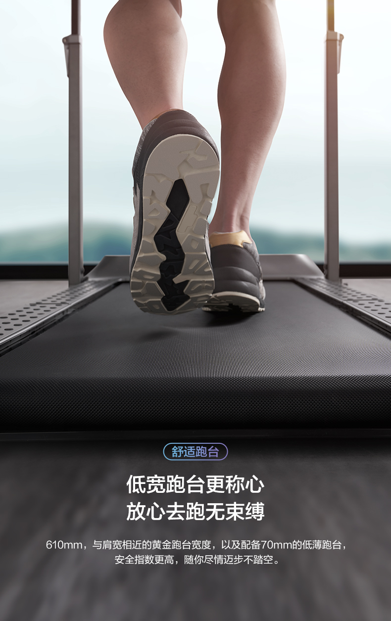 跑台 610mm、跑带 440mm、平台高度 70mm,范围速度0.5~12km/h。