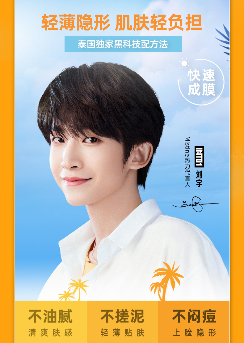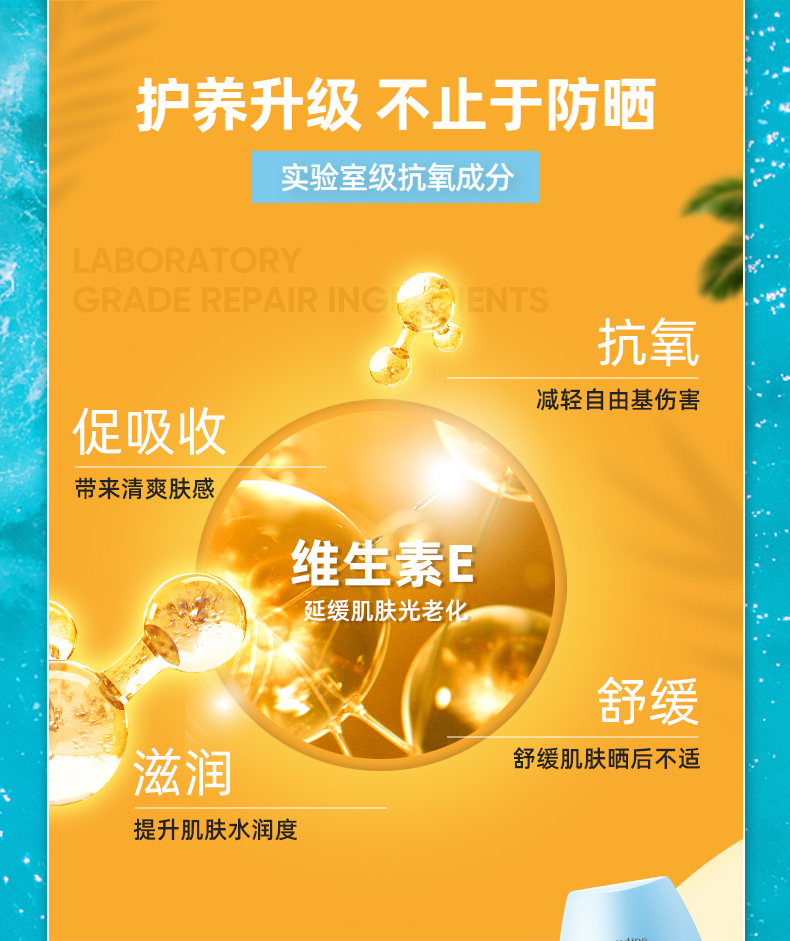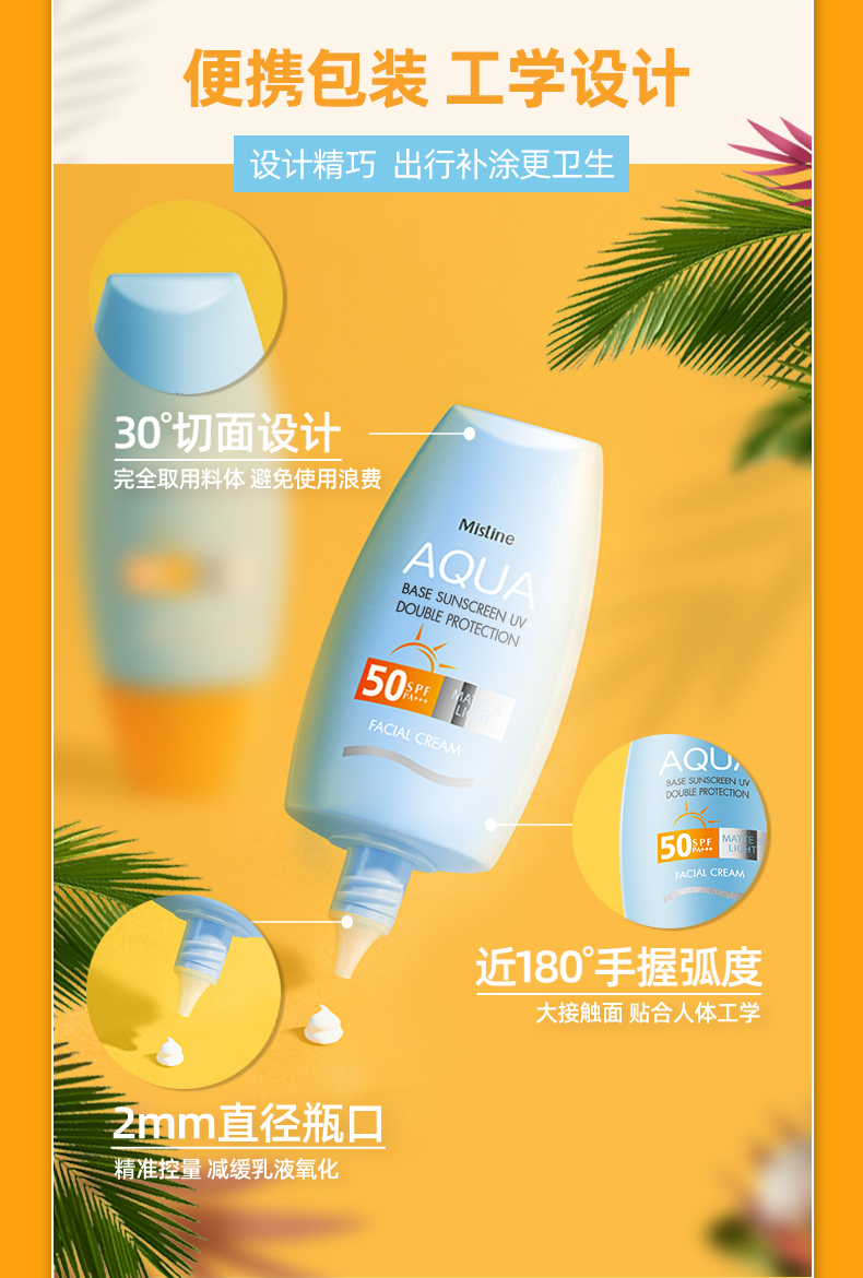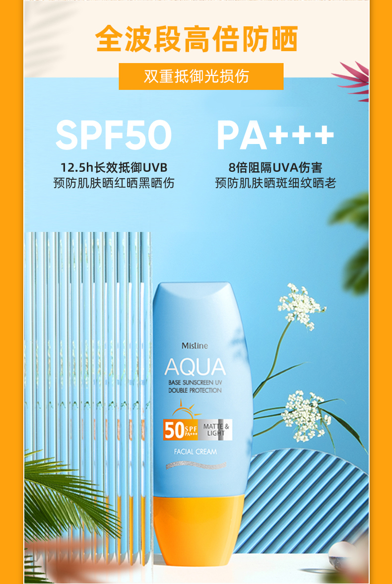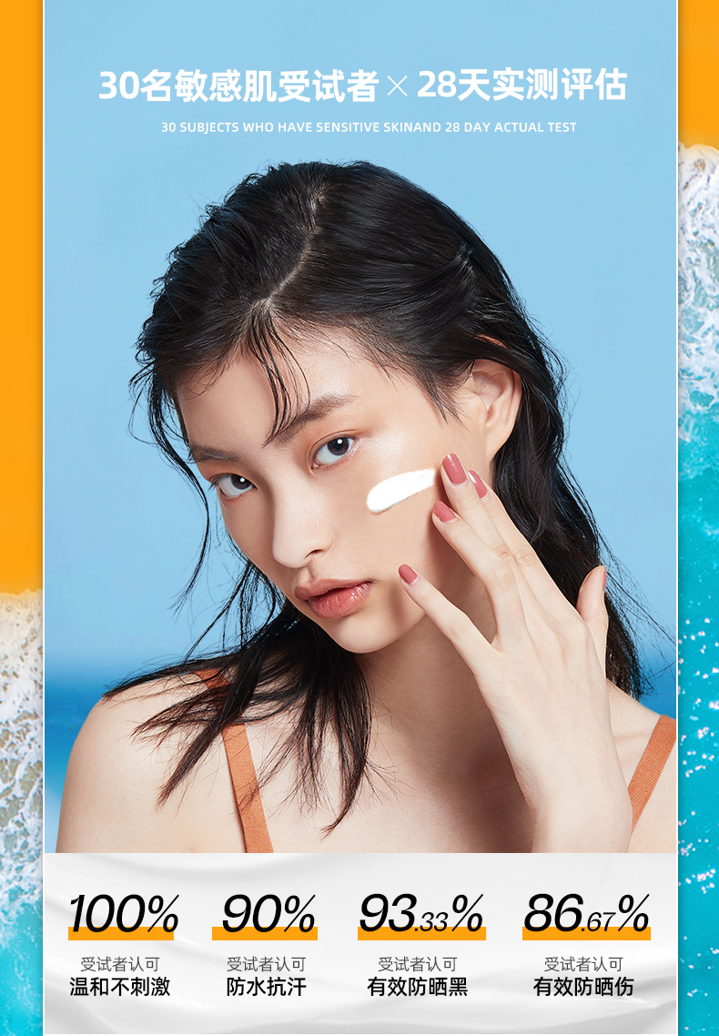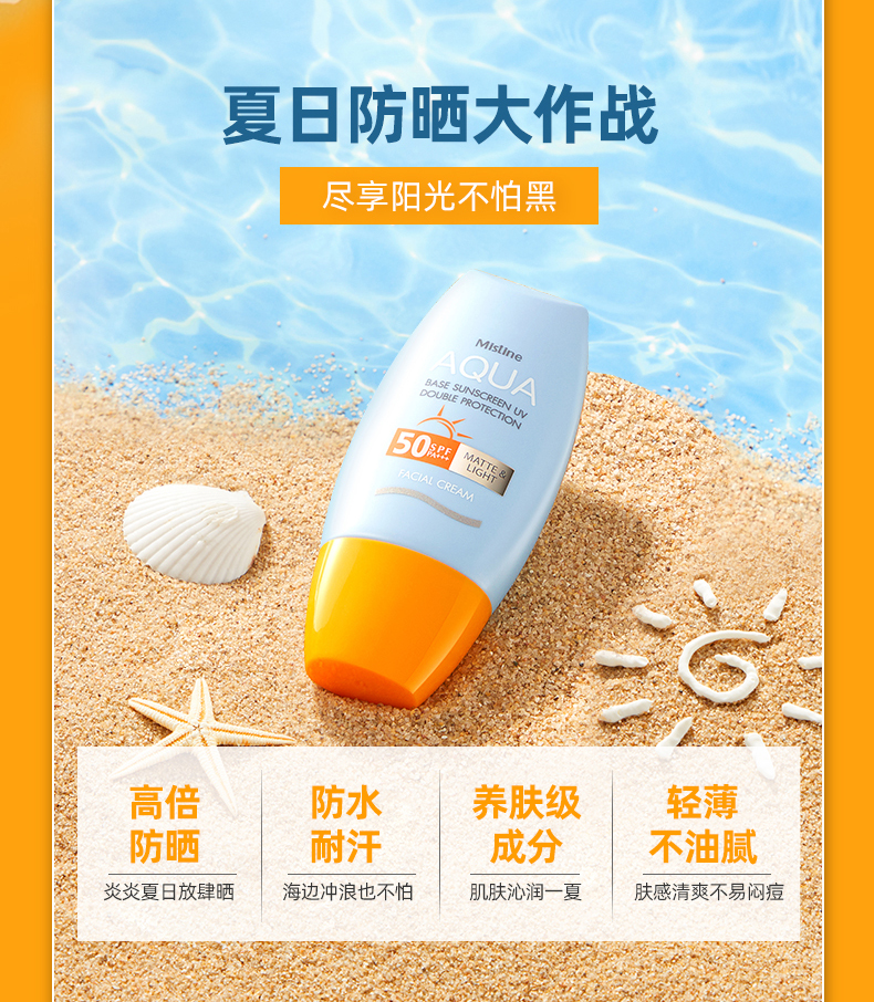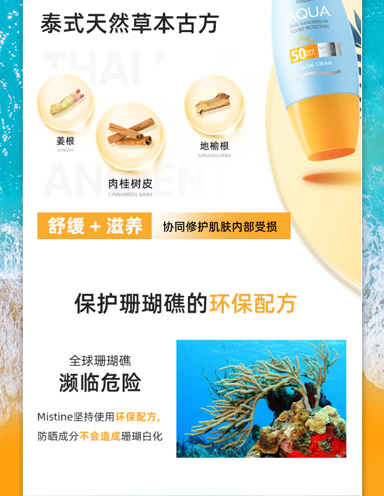 沙滩级全波段高倍防晒SPF50+/PA+++,12.5小时长效抵御UVB,配方环保不会损害珊瑚等海洋生物,配方中还含有姜根、肉桂树皮、地榆根等天然草本,可协同修护滋养受损肌肤。乳霜质地轻盈,不搓泥易推开,快速成膜,清爽不油腻,哑光隐形不影响妆容。