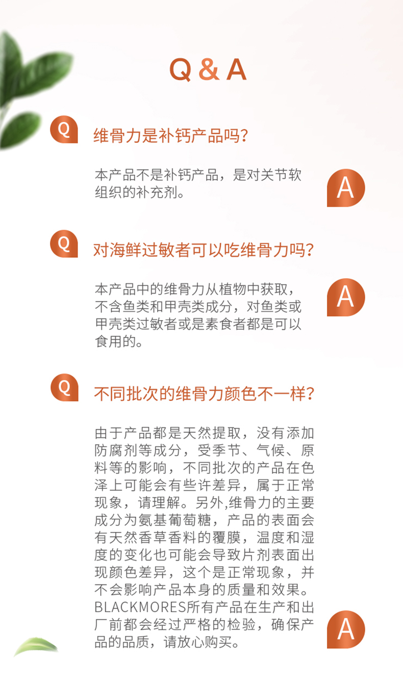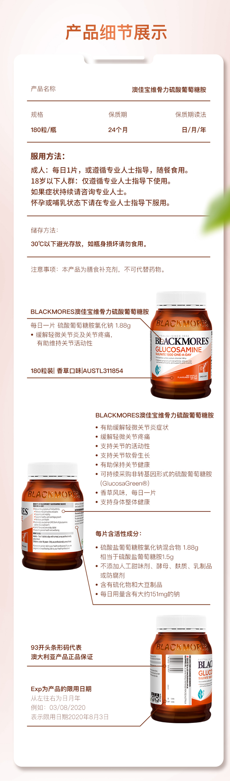 澳佳宝是澳大利亚的保健品品牌,成立于1930年,已经有近87年历史,一直努力为改善人们健康而推出优质天然保健品。在以天然方式改善健康的专业领域里是研发和营销的领导者,亦是维生素、矿物质和营养素方面的专家,提供一系列高品质的维生素、矿物质、草药以及营养补充品。此款氨糖软骨素维骨力胶囊,精选优质原料加工而成,养护关节,修复软骨,缓解关节炎症和肿胀。