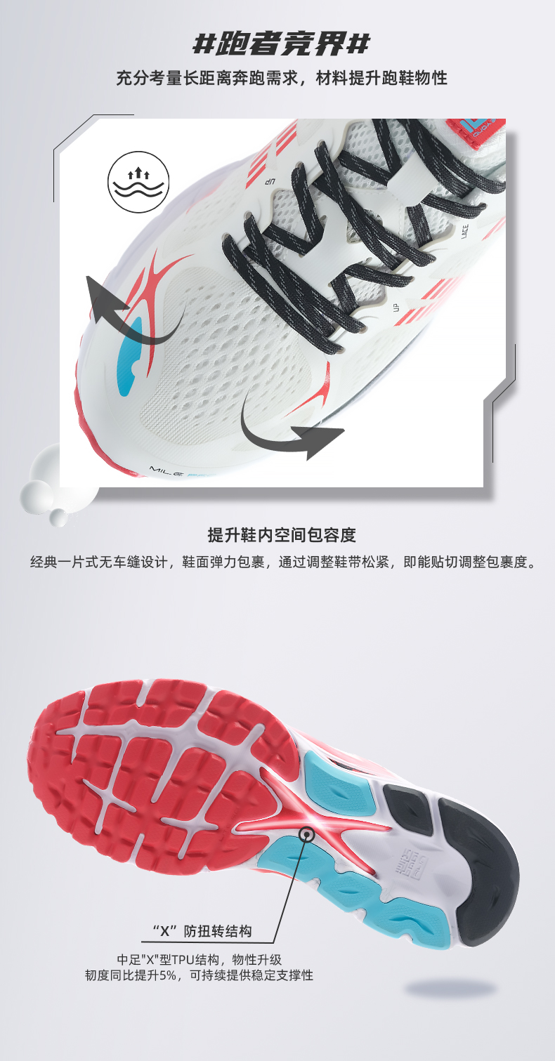 鞋面是一片式设计,用无缝拼接贴膜和弹性贾卡提花网布组成,轻盈透气,同时能舒适的包裹住双脚;鞋帮边缘与鞋面网布是用无缝热贴技术连接,轻盈弹性薄膜,可以有更强延展性与贴合度。