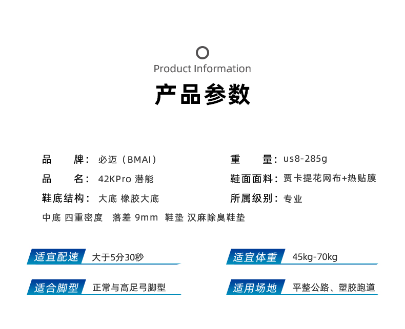 这双必迈Mile 42K Pro潜能 是定位全马拉松距离的42公里的专业跑步鞋,适合大多数人业余跑步爱好者,或者当做日常的跑步健身鞋。适合体重在45-70kg重的人穿,无论是公路和塑胶跑道都没问题。