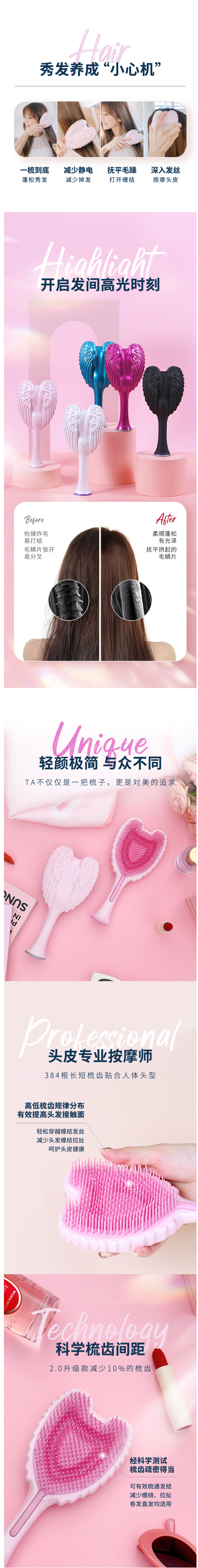 它的神奇之处在于无论是卷发、直发还是乱糟糟的头发,无论顺梳还是倒梳,无论干发湿发,都能一梳到底,打结的头发轻轻一梳就开,防静电并且避免拉扯发根,丝毫没有扯痛头皮的感觉,防止拉断或者拉脱头发,极大减少掉发,尤其适合长发妹纸。