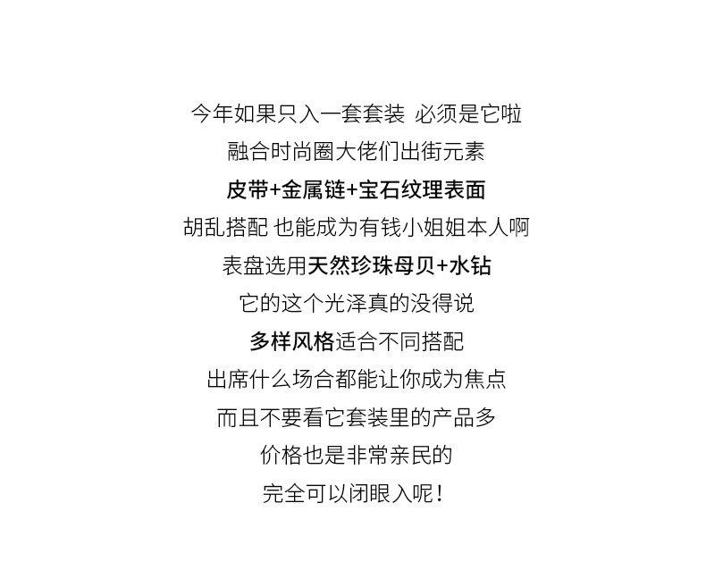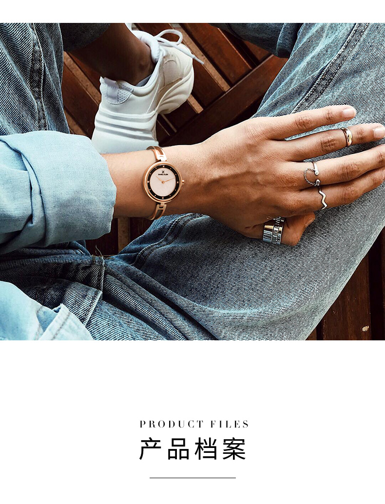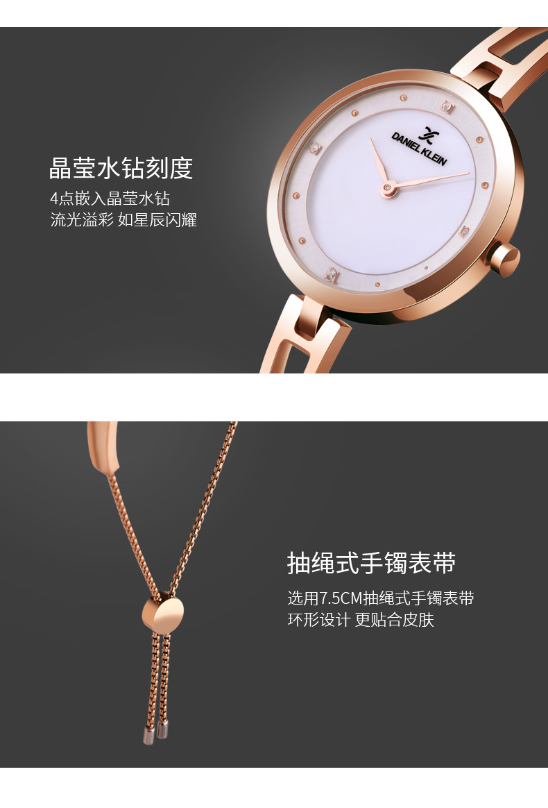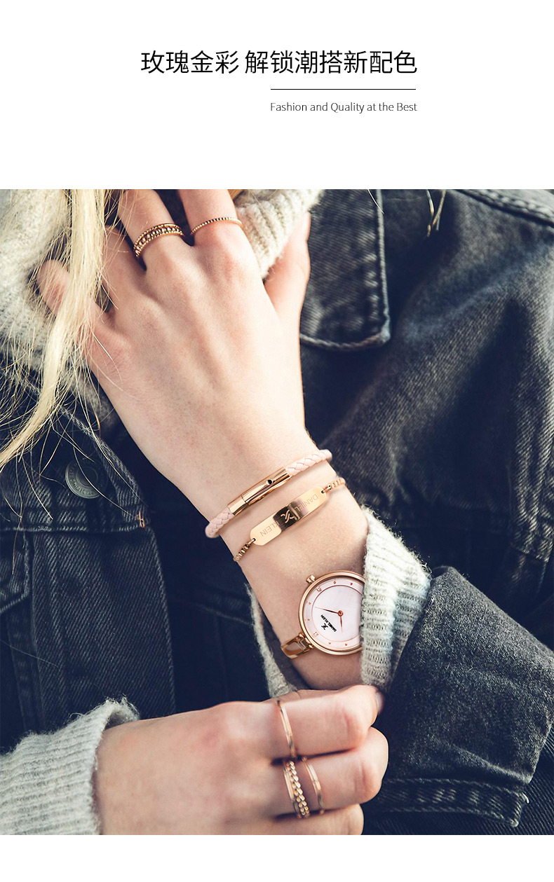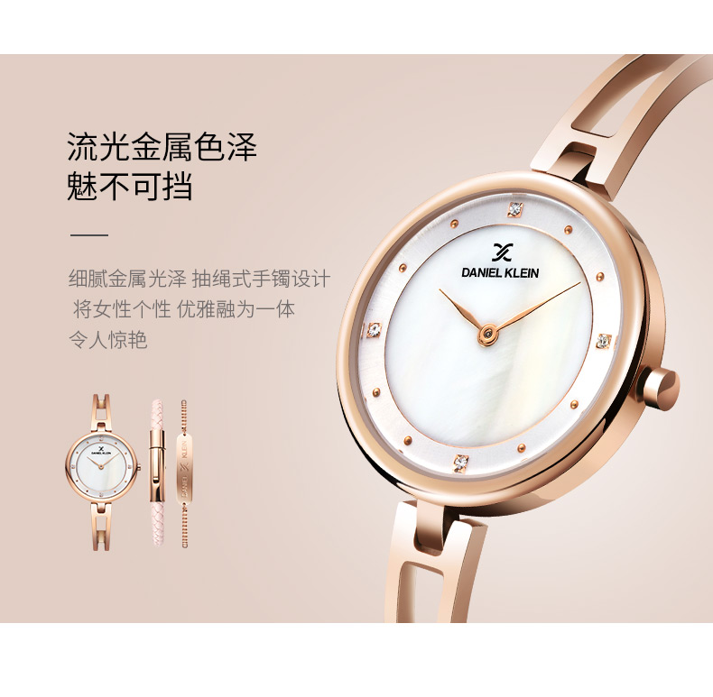 这款石英表表盘选用天然珍珠母贝+水钻,质感丰盈,4点位置嵌入晶莹的水钻,流光溢彩,光泽很好;抽绳式手镯设计,将女性的个性与优雅融为一体,令人惊艳。手链选用7.5cm的抽绳式手镯表带,环形设计,更加贴合肌肤。