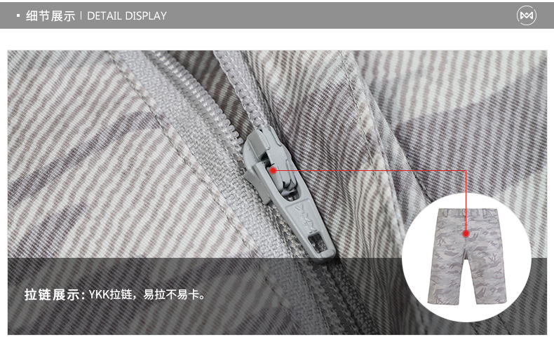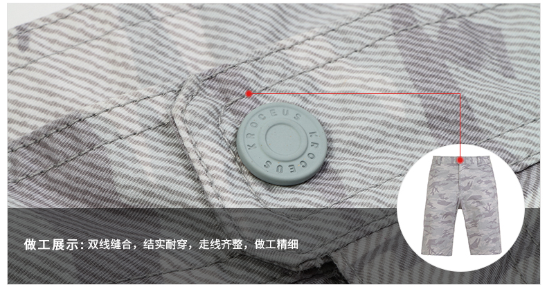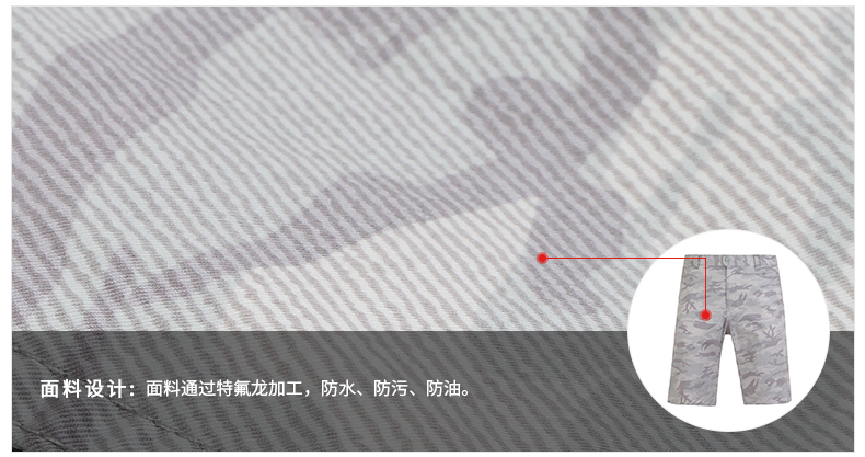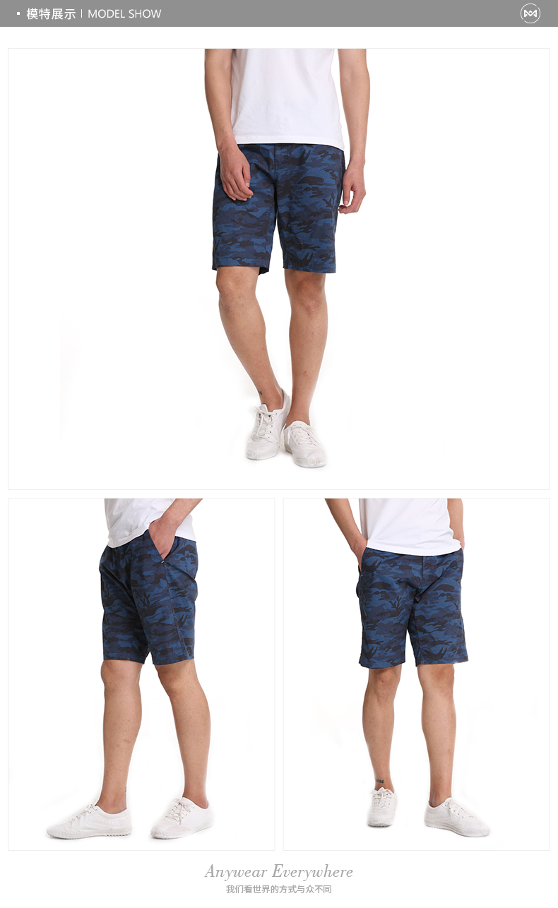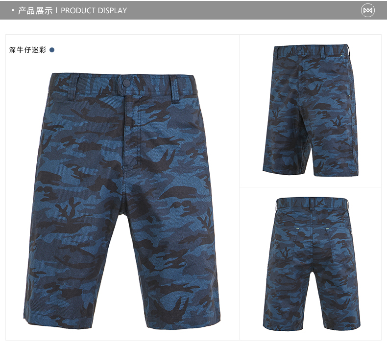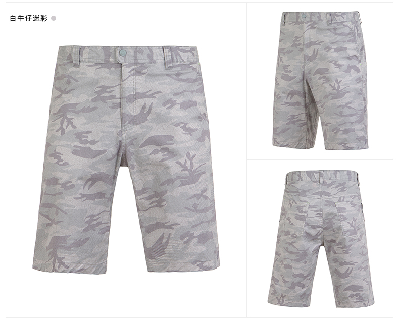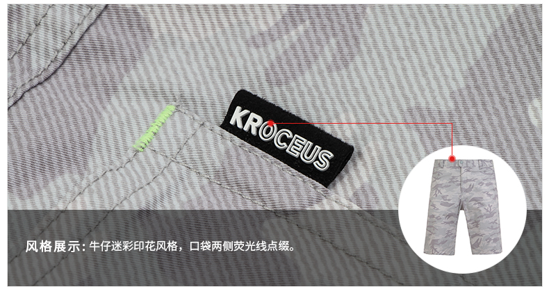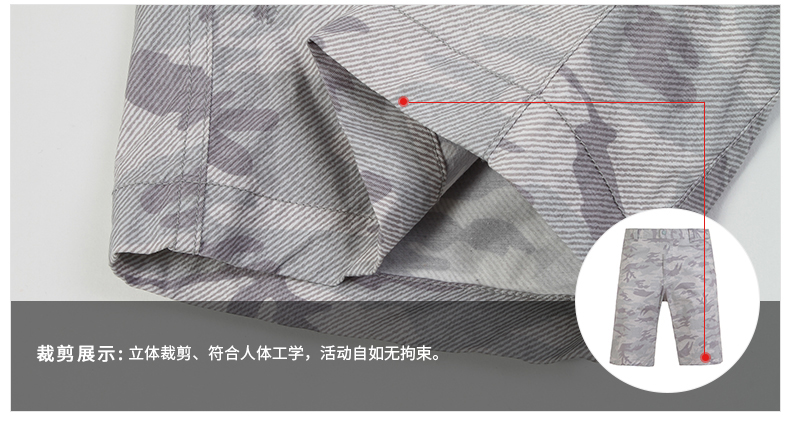 在款式上,5分裤长短,3D立体剪裁,上身更合体有型,不肥不紧;裤面是牛仔迷彩印花,口袋两侧荧光线点缀,适合城市休闲时穿。