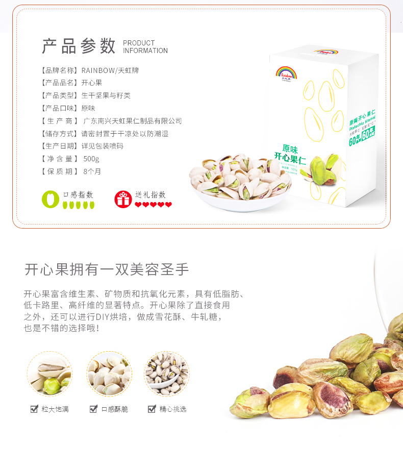 这款 开心果仁,原料美国加州进口,精选颗粒饱满,天然无添加,脱壳处理,精心烘培,口感香醇咸脆,营养丰富。除了可以直接食用,还可以作为烘焙材料。制作雪花酥、牛轧糖等,规格:500g/袋。