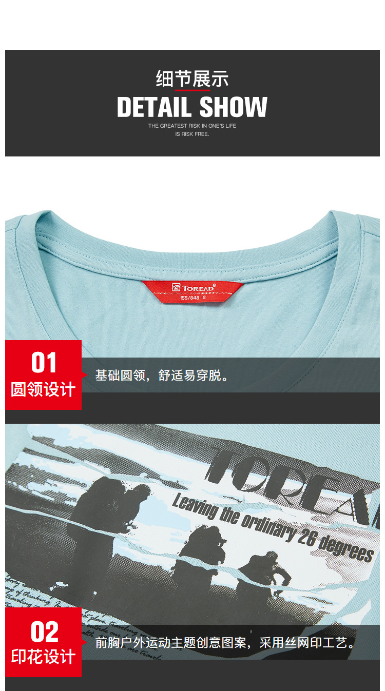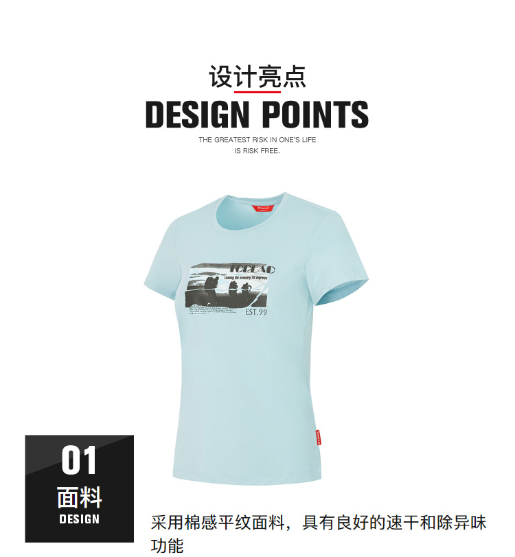 这款探路速干T恤,使用棉感平纹面料—100%聚酯纤维,摸起来手感接近纯棉,穿着更舒适。功能上吸湿排汗,速干透气,适用于夏季或运动时穿。