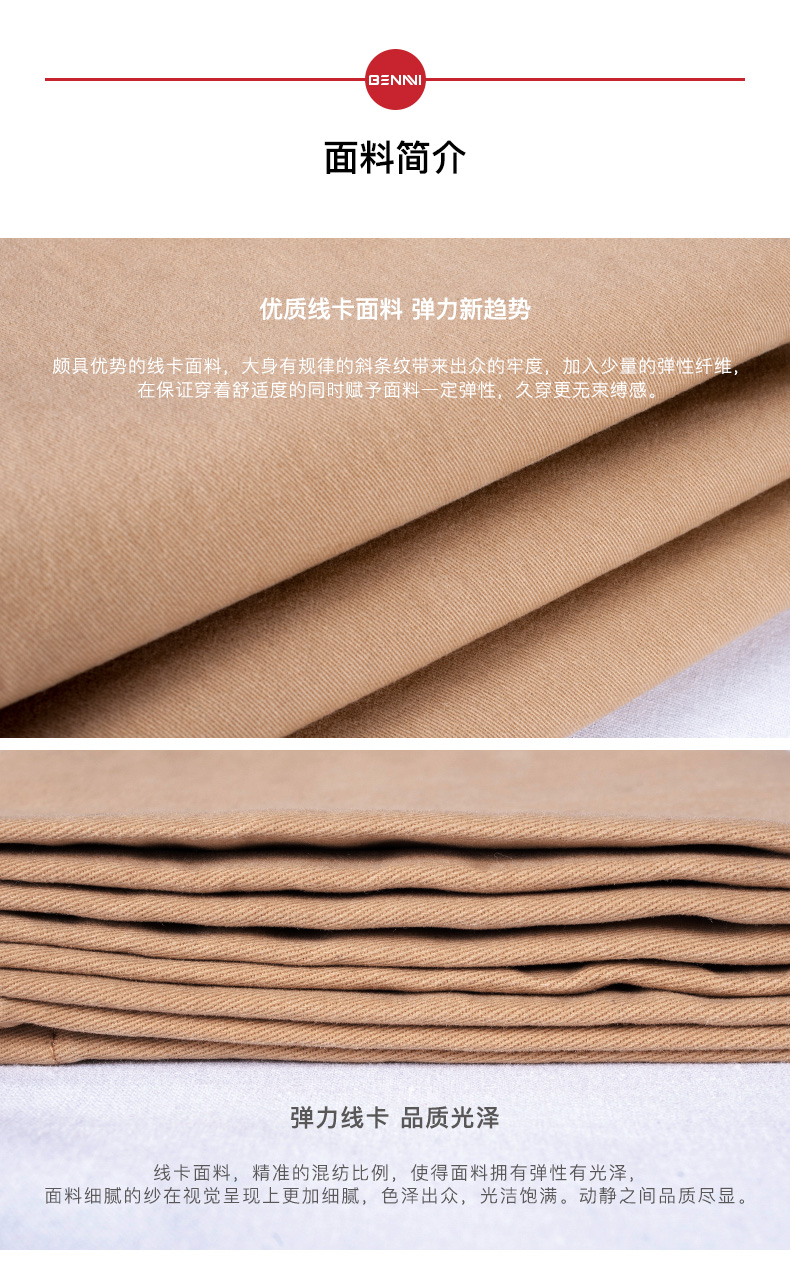 本米男士休闲裤,面料是斜纹线卡面料,以97%棉混3%氨纶弹力纤维,带有微弹力,穿着无拘束舒适度比较好。整体直筒版型,在小腿处略收紧,瞬间拉长腿部线条。除了左右裤袋,后身也有口袋。风格介于正装和休闲之间,面料厚度中等,四季可穿。