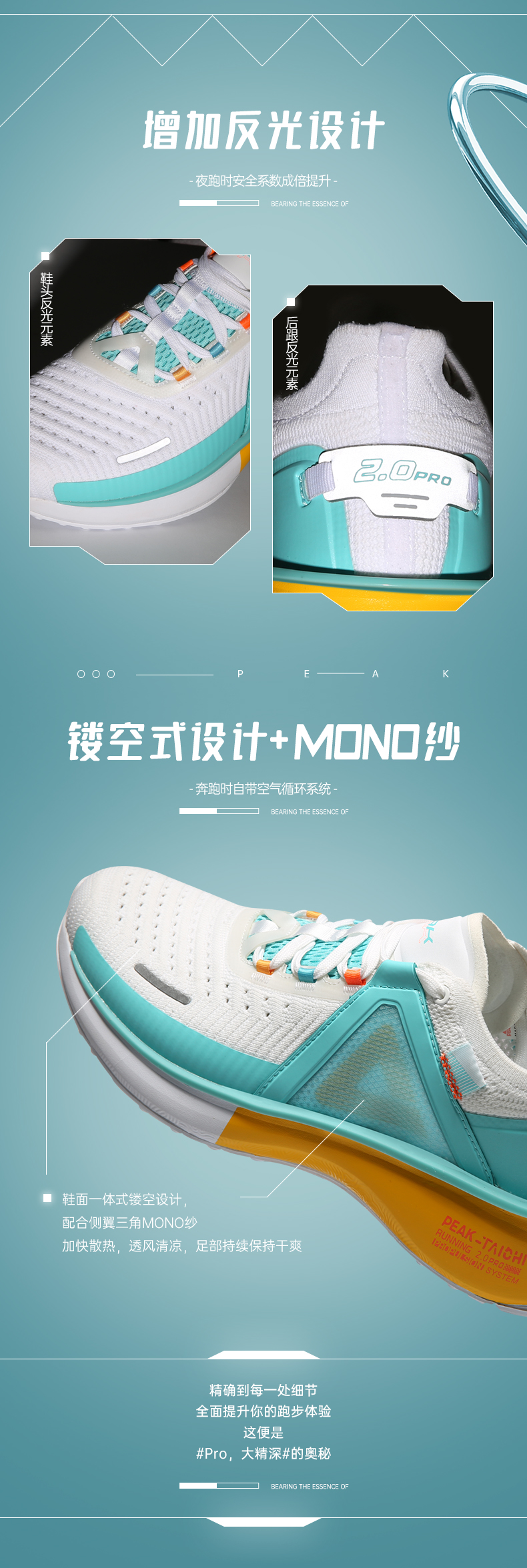 鞋面一体式镂空设计,在需要支撑和保护的地方提高了强度和密度,在需要透气的地方孔隙更大,透气性更强,前后都增加了反光条,保证夜跑时的安全系数,外侧为三角MONO纱,内侧单层织造布,加强散热,透风清凉,足部保持干爽。