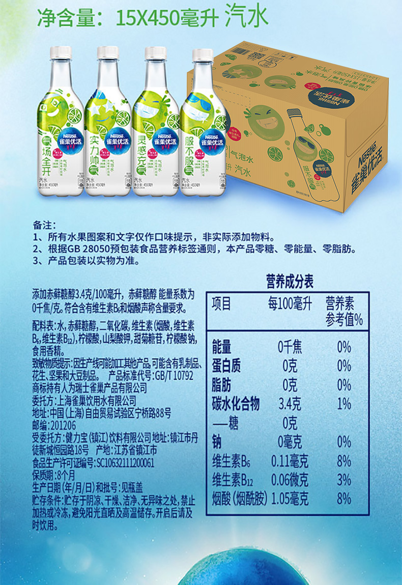 天猫超市次日可达。雀巢 优活冰极青柠风味 气泡水饮料,0糖0卡0脂肪,清爽水果味,畅快气泡感。主要甜味来自赤藓糖醇和甜菊糖苷,规格:450ML*15瓶~