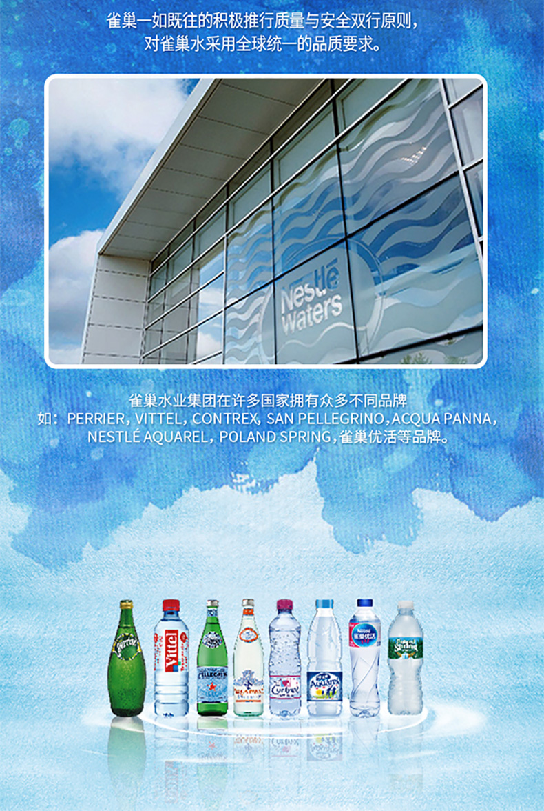 雀巢优活(Nestlé Pure Life)是雀巢水业集团的核心品牌。在世界瓶装水市场中高居榜首地位。生产过程的严格监控、执行严格卫生条件,确保水质从水源灌装到运输销售的全程高品质。