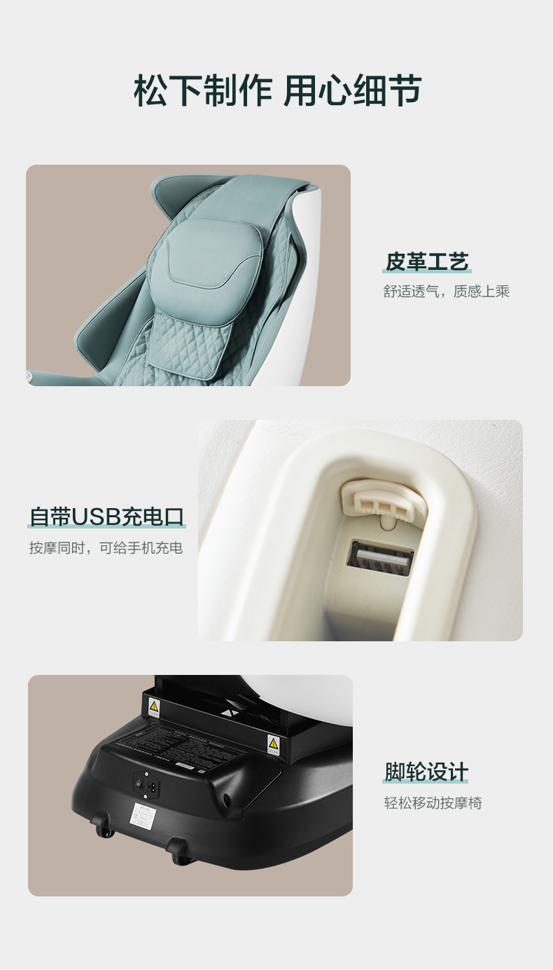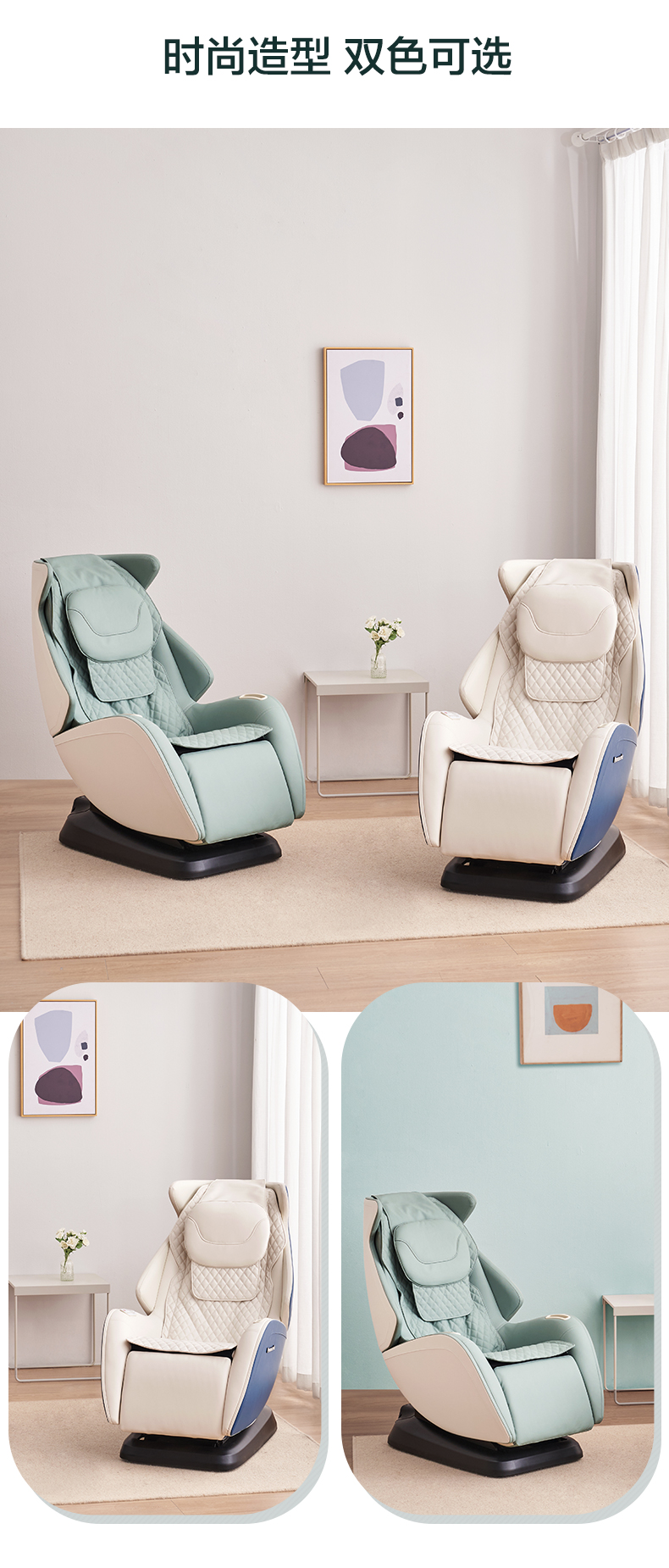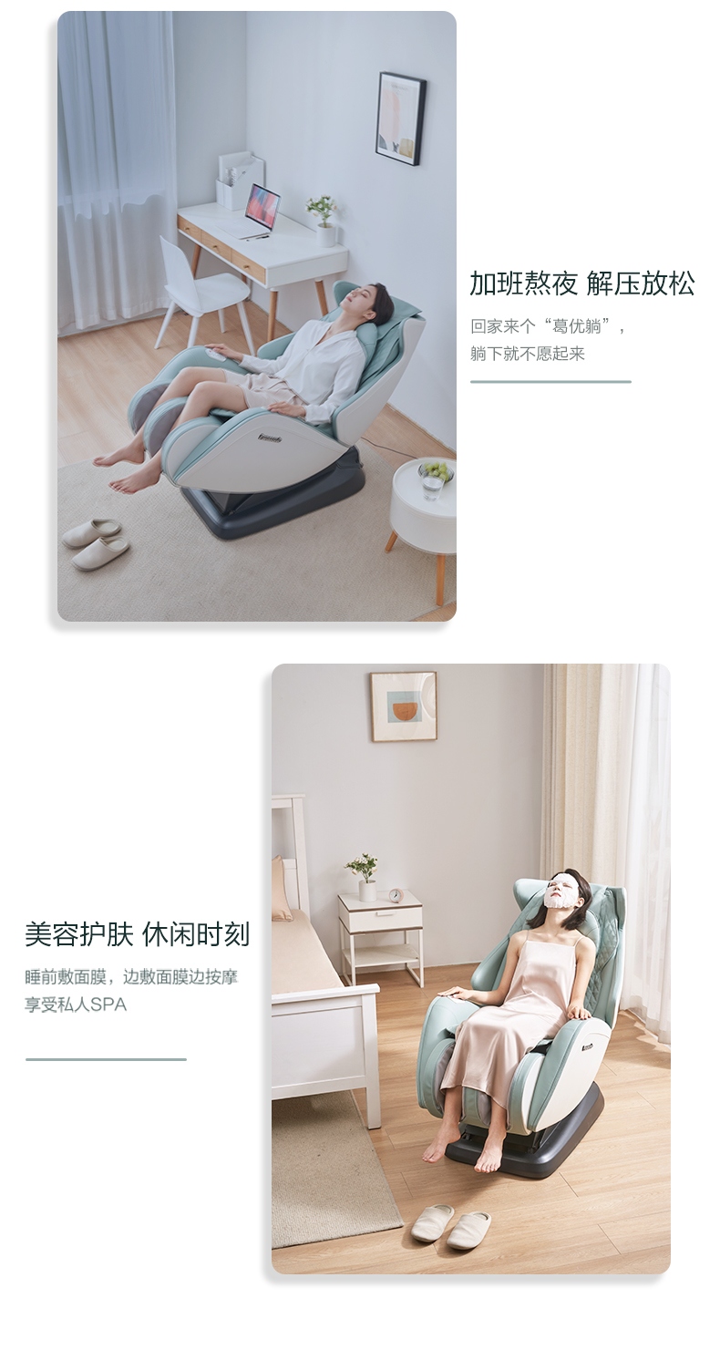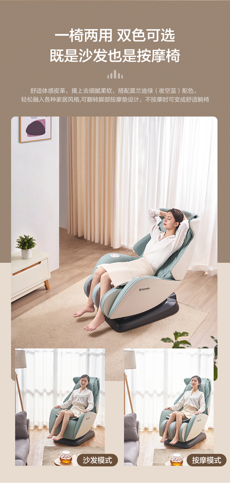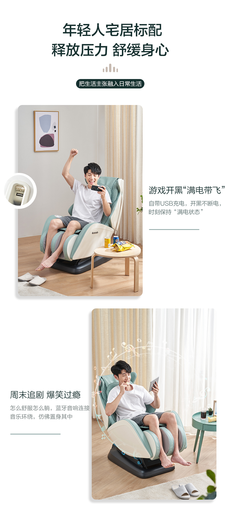 采用亲肤体感皮革,摸上去细腻柔软,搭配莫兰迪绿配色,融入各种家居风格,可翻转脚部按摩垫设计,一椅两用,不按摩时可变成舒适躺椅,自带USB充电、开黑不断电、时刻保持满电状态。