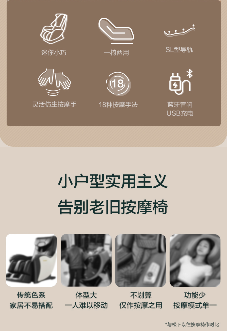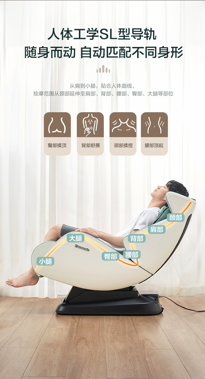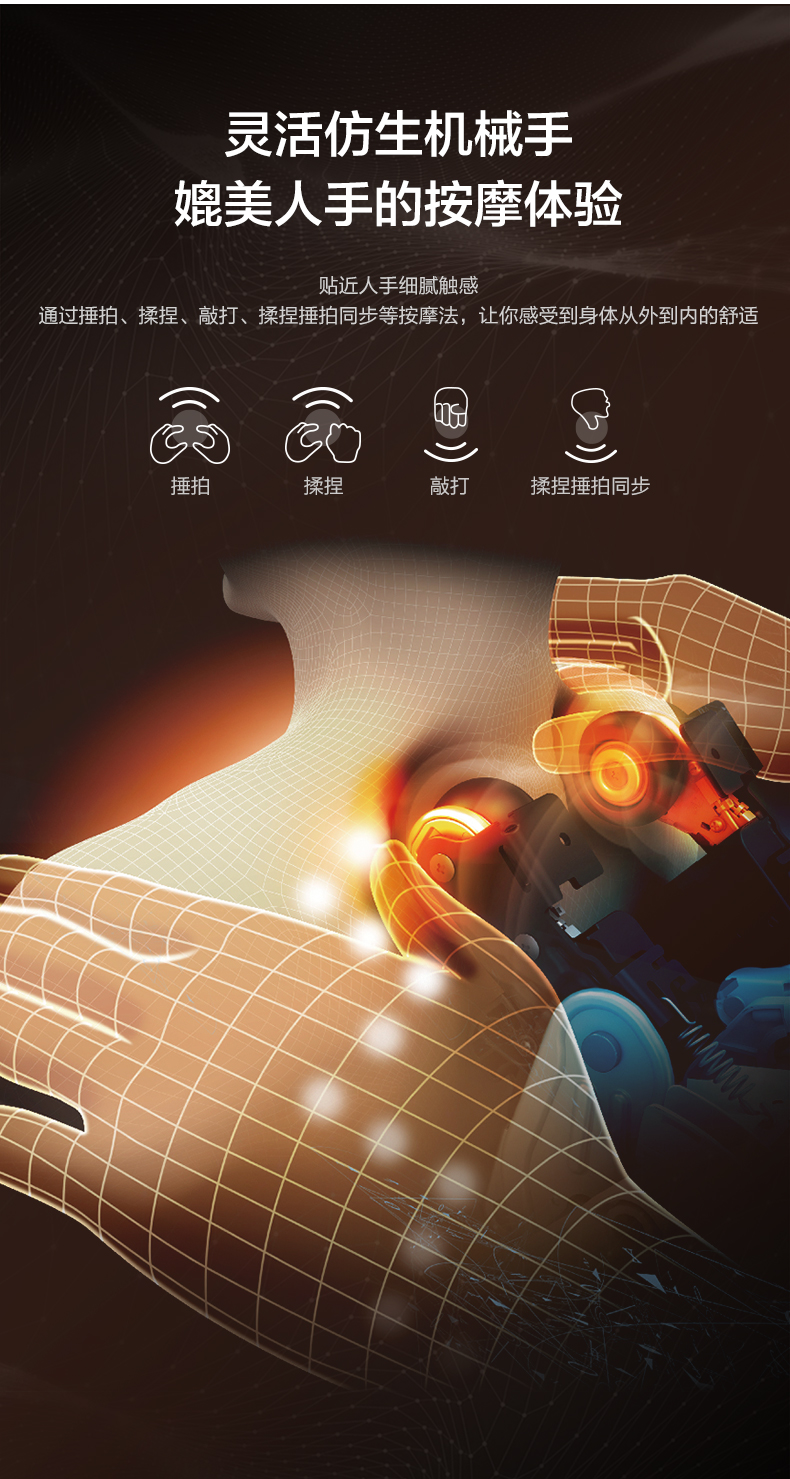 人体工学SL型导轨,随身而动自动匹配不同身形,从肩到小腿,贴合人体曲线,灵活仿生机械手媲美人手的按摩体验,按摩范围从颈部延伸至肩部、背部、腰部、臀部、大腿等部位。