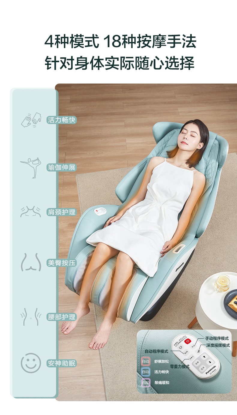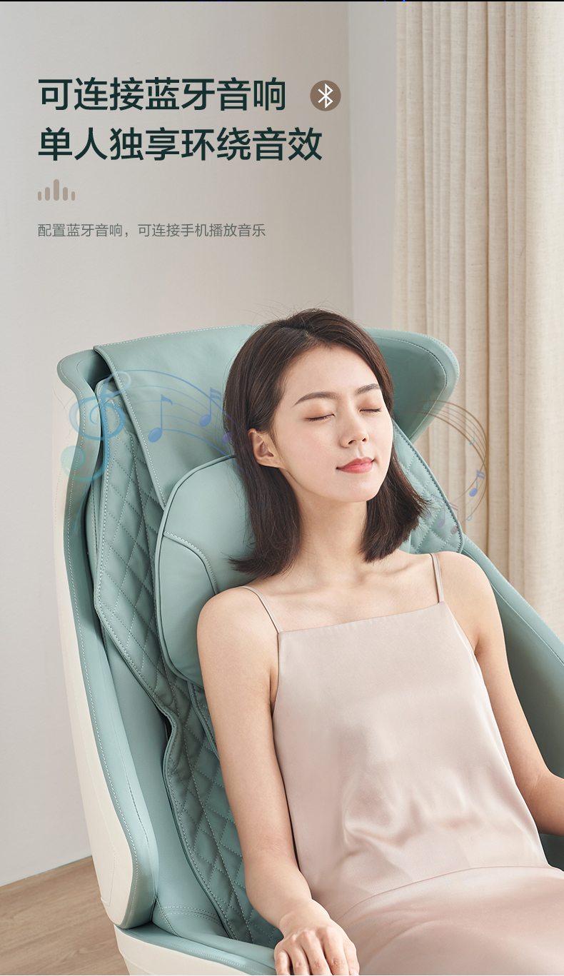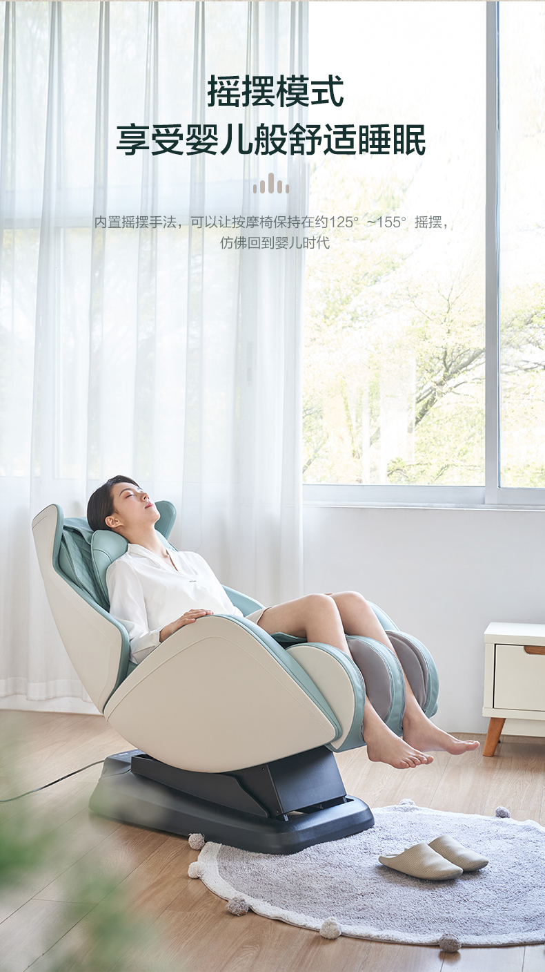 共有4种模式18种按摩手法,针对身体实际随心选择,还可个性化定制模式,对身体特定部位进行定点按摩,重点放松。其中摇摆模式可以让按摩椅保持在约125~155°摇摆,让人仿佛回到婴儿时代,享受婴舒适睡眠。内置蓝牙音响,可连接手机播放,边按摩变享受。