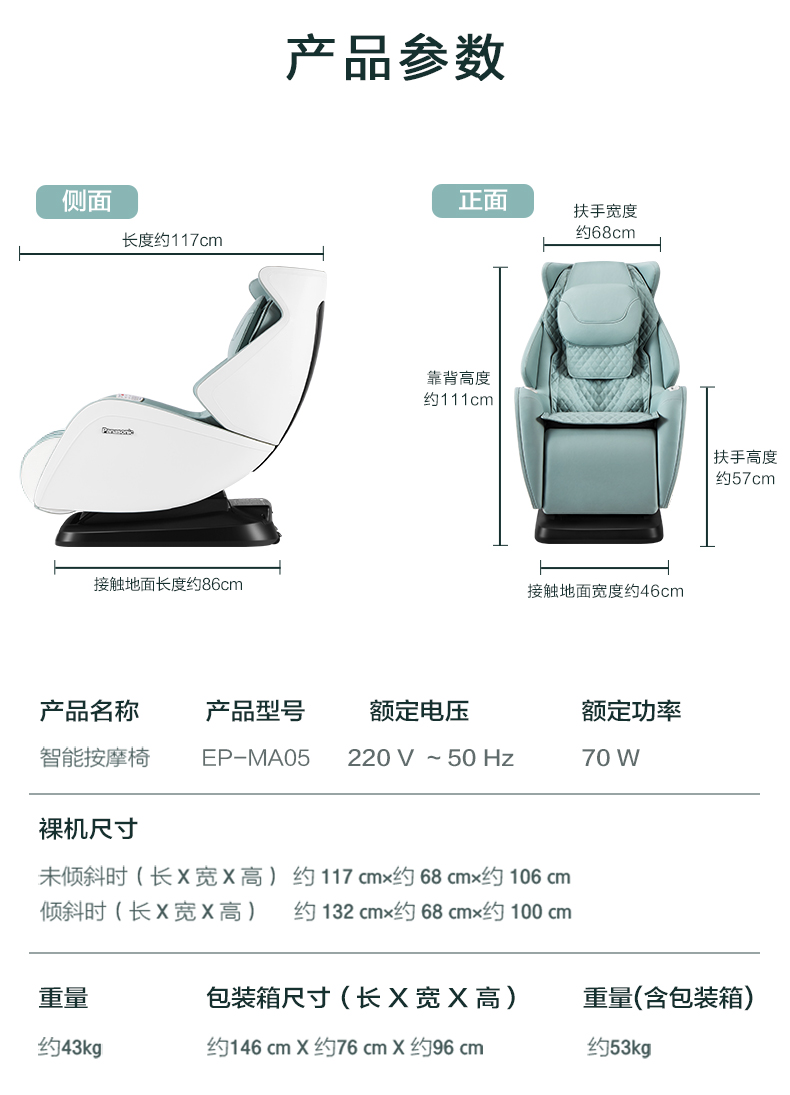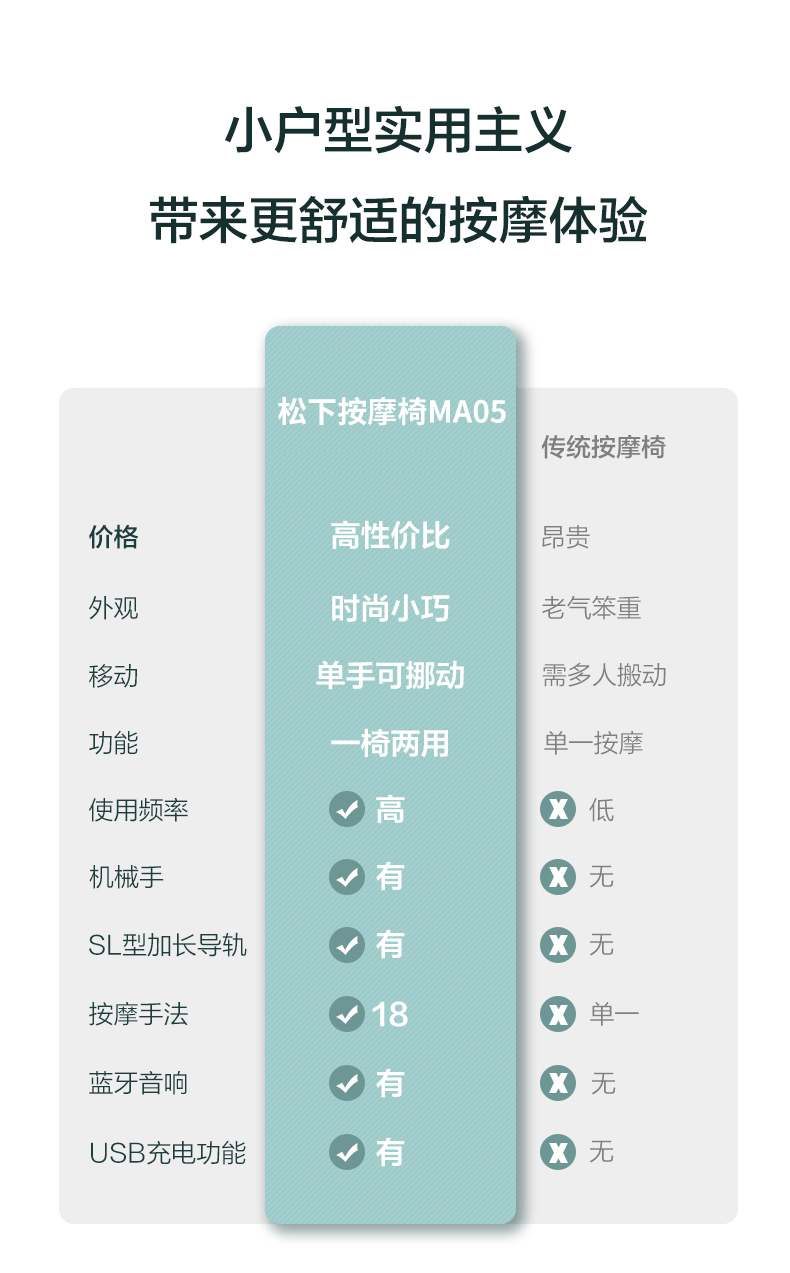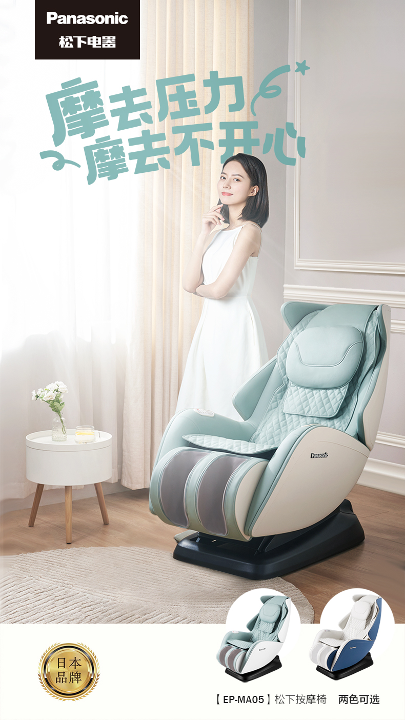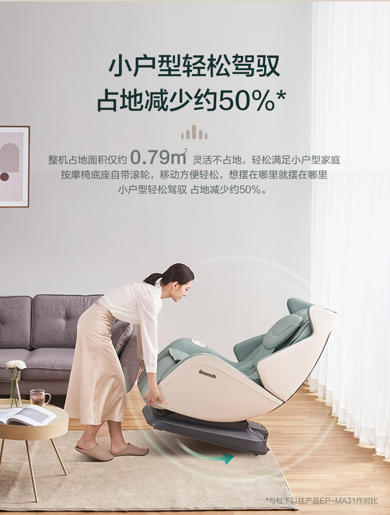 Panasonic松下EP-MA05智能按摩椅,整机占地面积仅约0.79m²,相比普通按摩仪减少约50%,轻松满足小户型家庭,按摩椅底座自带滚轮,移动方便轻松,想摆在哪里就摆在哪里。