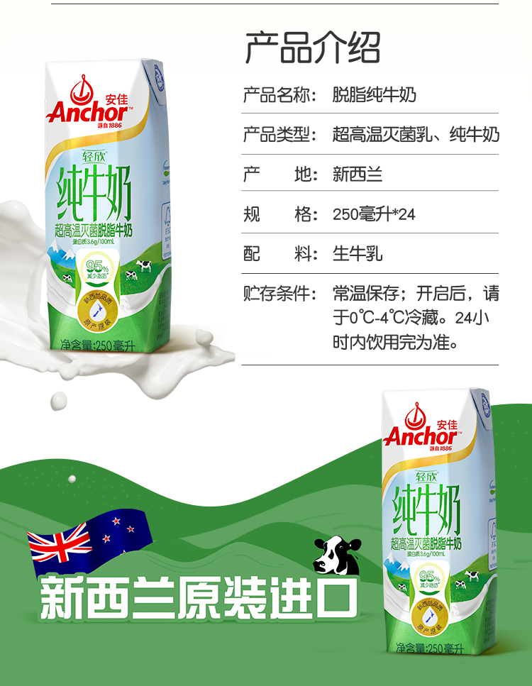 安佳脱脂牛奶,新西兰原装进口,蛋白质含量高达3.6g/100ml,每盒脱去67大卡,相当于跑步10分钟消耗的热量,脱脂不脱味,清甜好喝,非常适合有健身,减脂需求人群。超高温灭菌,历经多次检测,严格遵守新西兰和中国严苛质量标准,品质有保障。