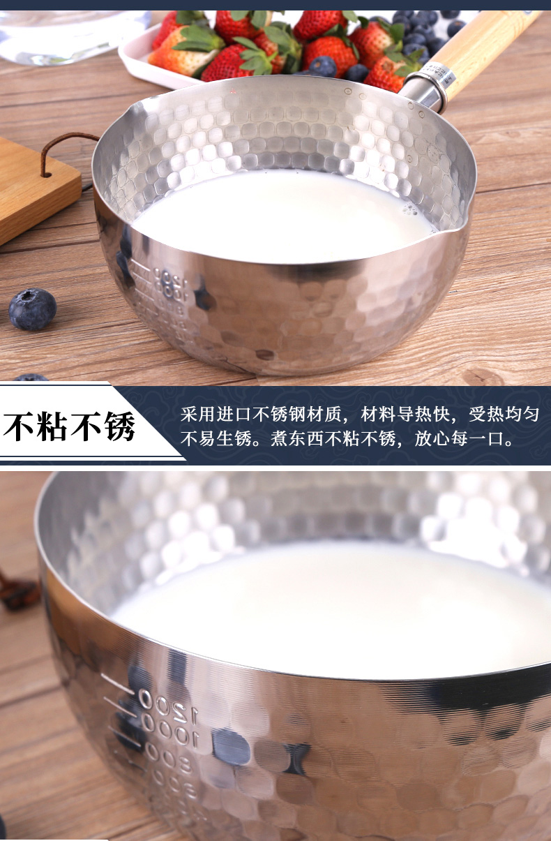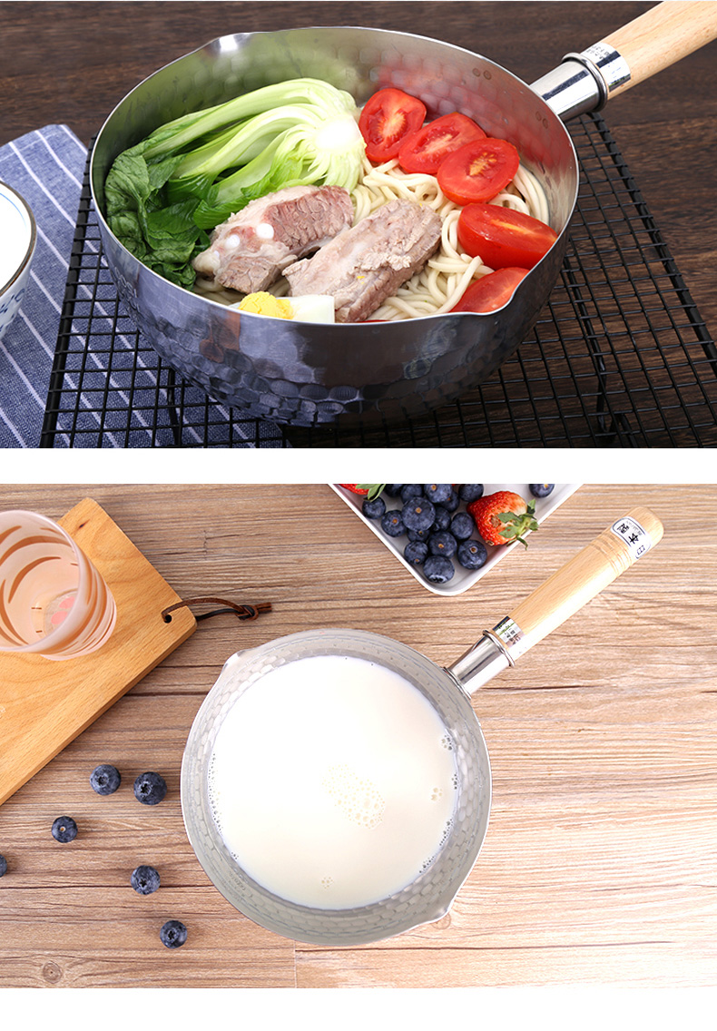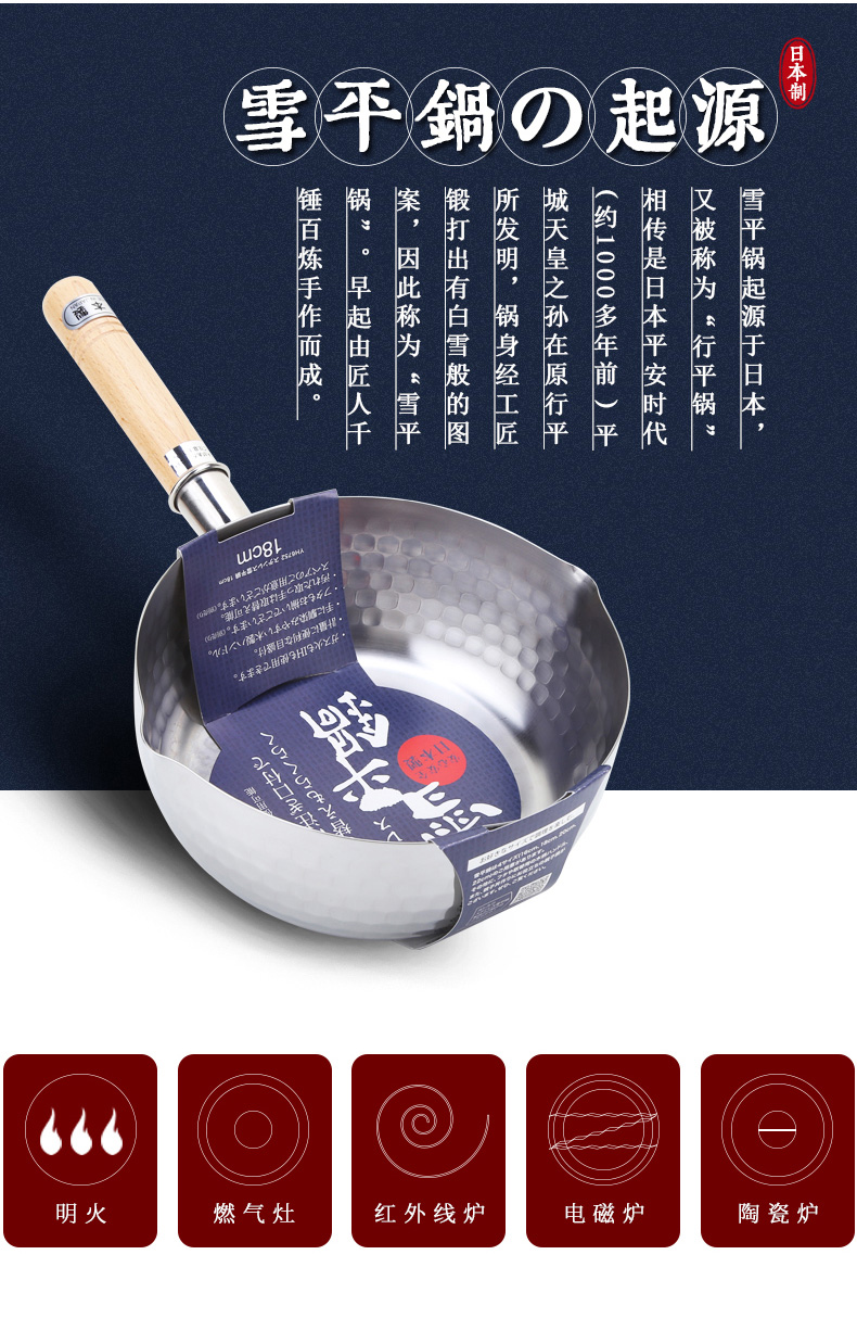 这款雪平锅进口不锈钢材质、锻打雪花纹、无涂层、不粘不锈、不易溢锅,具有轻盈耐用,导热快,电磁炉、电陶炉、明火都可以用的优点,配上精心打磨榉木手柄,结实耐用握感舒适。适合烹、炸、煮、熬、煲多种烹饪方式,是日本家庭必备“神器”。