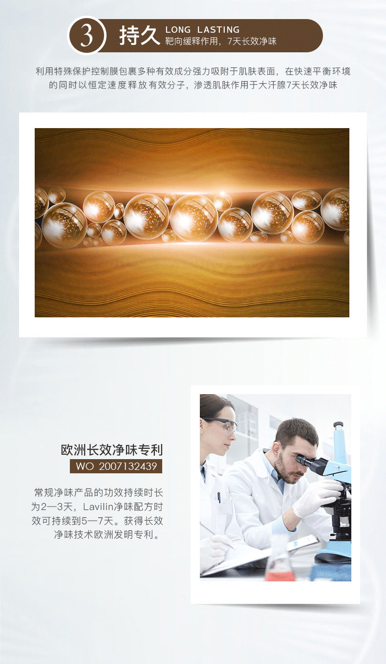 1.欧洲长效净味专利(WO 2007132439),常规净味产品的功效持续时间为2~3天,Lavilin净味配方时效可持续到5~7天。