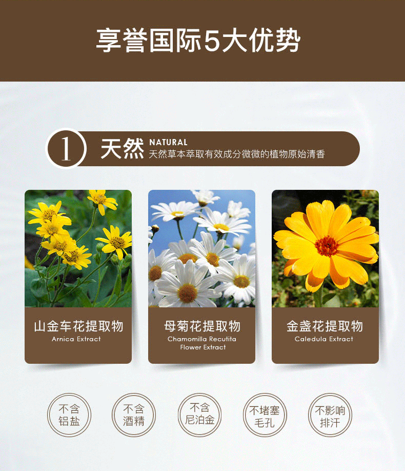 主要成分是母菊花提取物、牛奶蛋白、金盏花、山金车花提取物,在祛除异味的同时兼具保湿、舒缓等护肤功效,不含铝盐、酒精、尼泊金这些损害肌肤的成分,不会堵塞毛孔影响排汗。