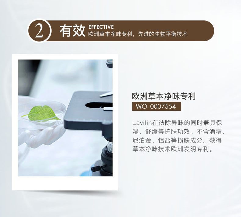 2.欧洲草本净味技术专利(WO 0007554),Lavilin在祛除异味的同时兼具保湿、舒缓等护肤功效,不含酒精、尼泊金、铝盐等损肤成分。