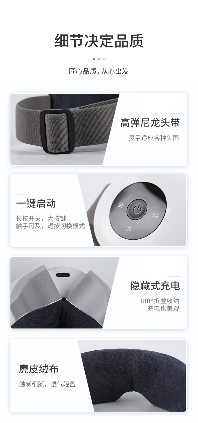 细节上:一件操作简单方便,老人小孩也能轻松操作,带有语音播报功能,轻松识别当前工作状态;按摩仪内里采用麂皮绒布、触感细腻、透气轻盈,佩戴舒适,而且耐用易清洁;内置1200毫安充电电池,续航持久、无线佩戴更为舒适,整体可180度折叠小巧轻便,适合各种脸型,日常通勤、出差、旅行携带方便。