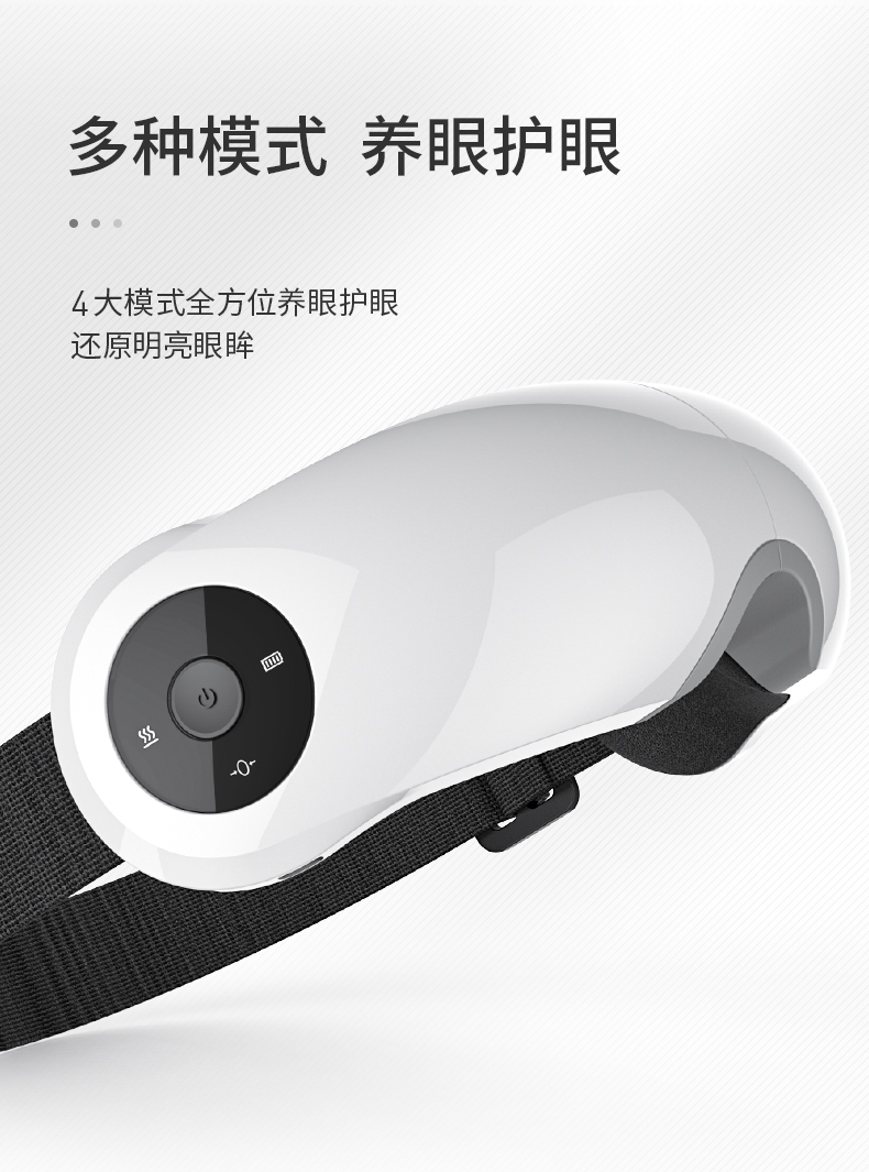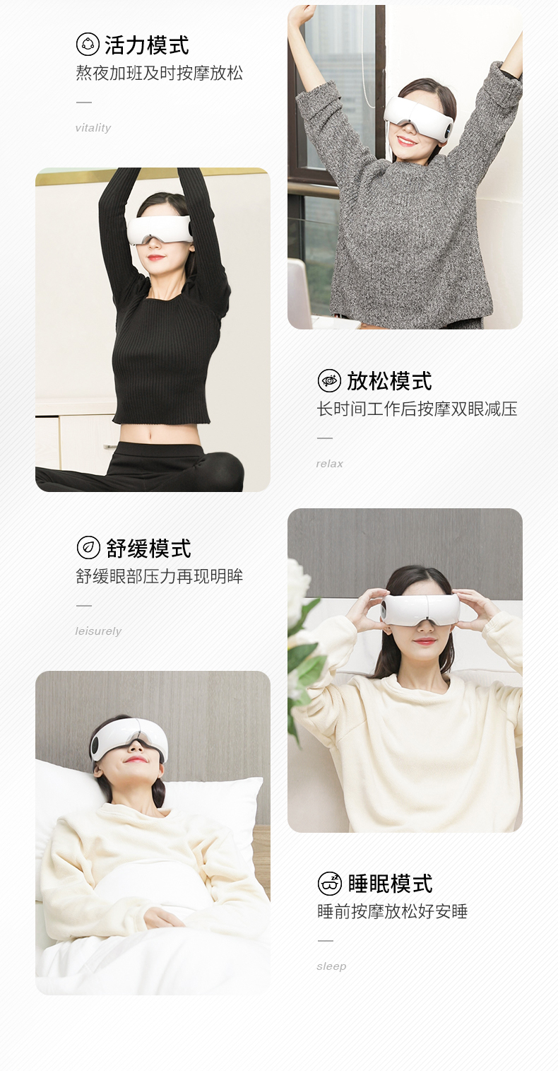 升级活力、放松、舒缓、护眼、睡眠、5种按摩模式、满足多元化按摩需求。可缓解眼部疲劳、干涩、水肿、黑眼圈等,特别适合白领、学生、喜欢玩手机、用电脑等用眼过度人群。
