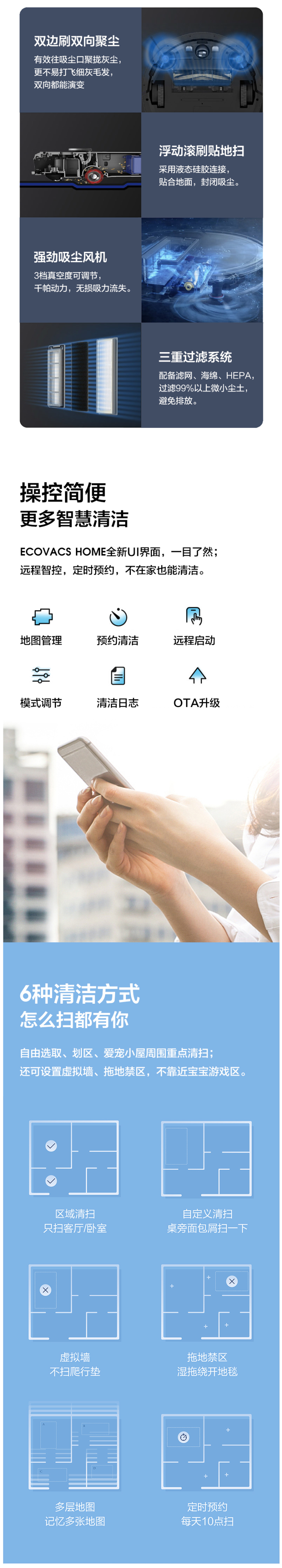 清扫方面,2个边刷加1个浮动滚刷,清洁更干净,外加定制抹布和240ml微控水箱,能够实现扫拖一体,方便快捷。尘盒采用三层精密过滤设计,最大程度避免二次污染,且过滤组件可直接水洗,减少更换滤网的费用。滚刷两侧盖板可以拆卸,方便清理毛发。