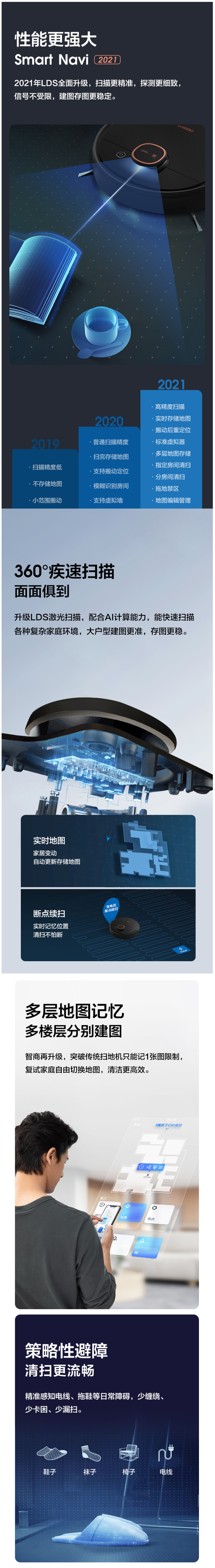 核心的计算机视觉+路径规划的能力上,T5使用了了LDS第4代激光扫描模块,并搭载Smart Navi2.0全局规划系统,全身有37组传感器,建模更准,减少碰撞,这一套组合是科沃斯多年的积淀,也是科沃斯跟其他品牌相比最大的优势。