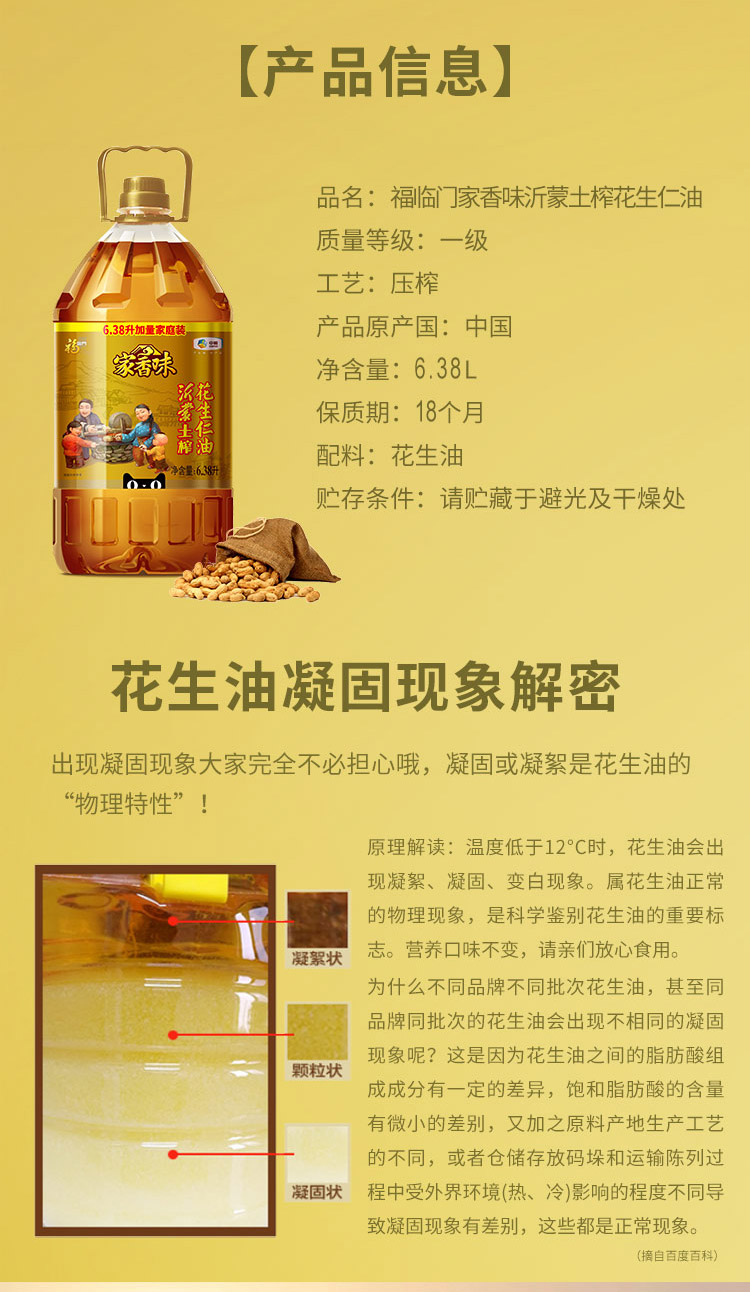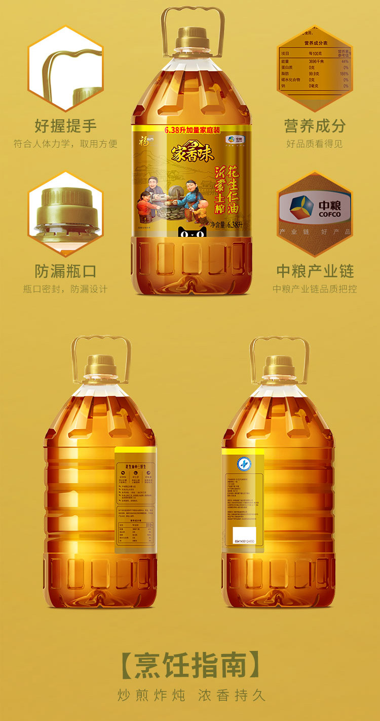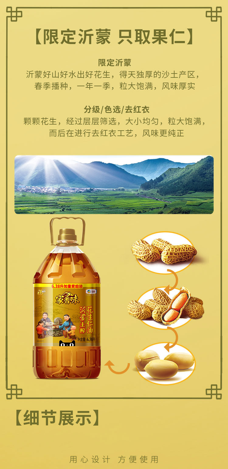 这款家香味 沂蒙土榨花生油是中粮旗下最顶级的土榨花生油,对标的是胡姬花古法小榨,只选择沂蒙山地区的大号花生,除了去除外壳以外还要去掉外层红衣,然后经过传统的土榨工艺,3重提香,使得花生油的香味浓郁又持久。