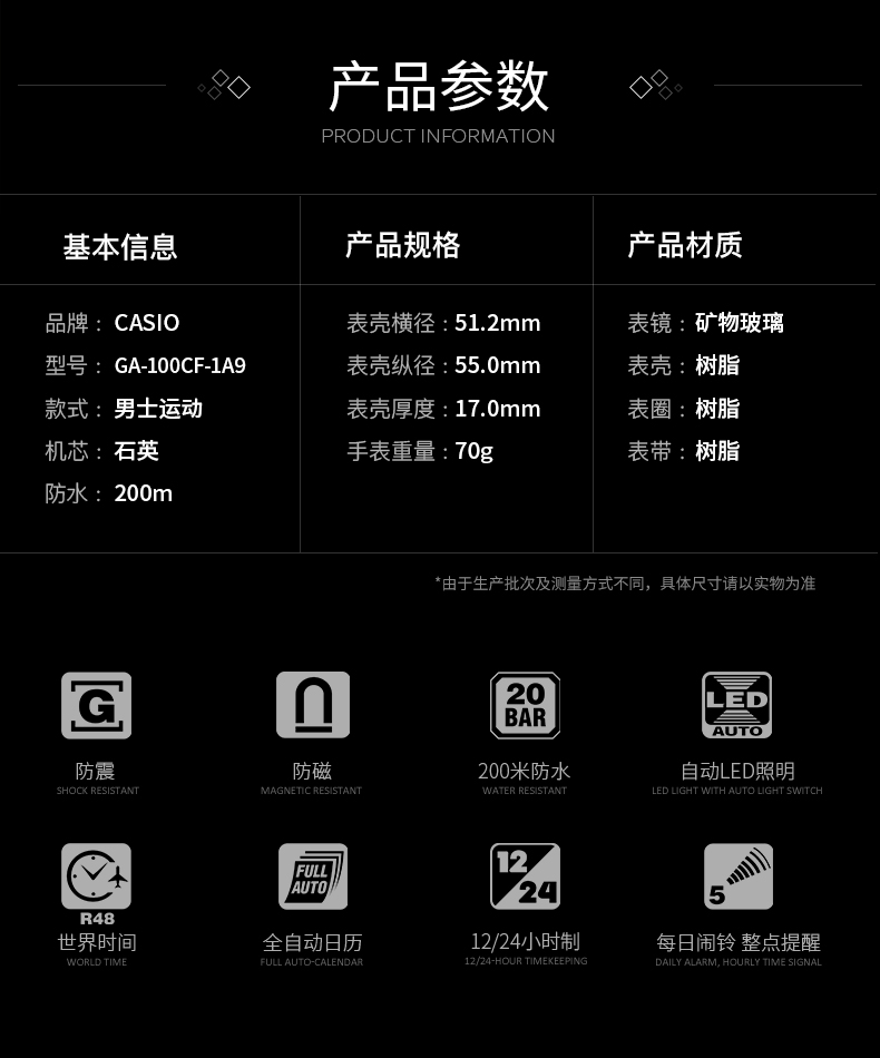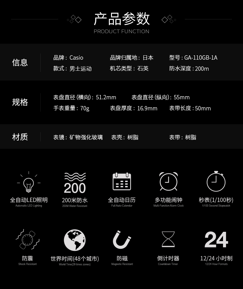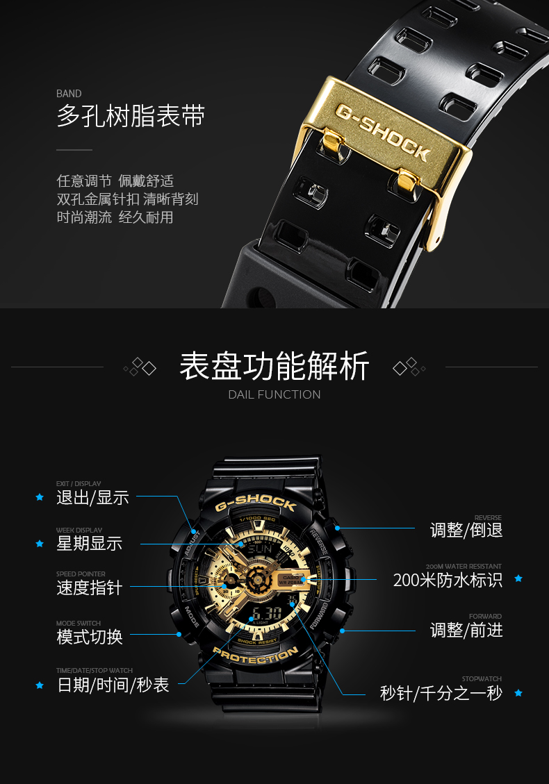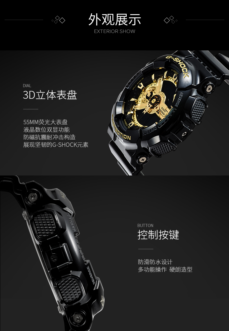 这款卡西欧 GA-110GB-1A运动手表,日本原产,属于旗下最知名的G SHOCK系列,是限量黑金悟空版,黑色和金色的组合,非常非常帅气。