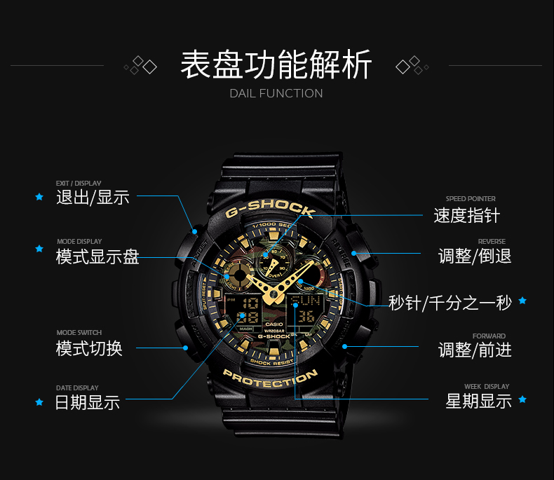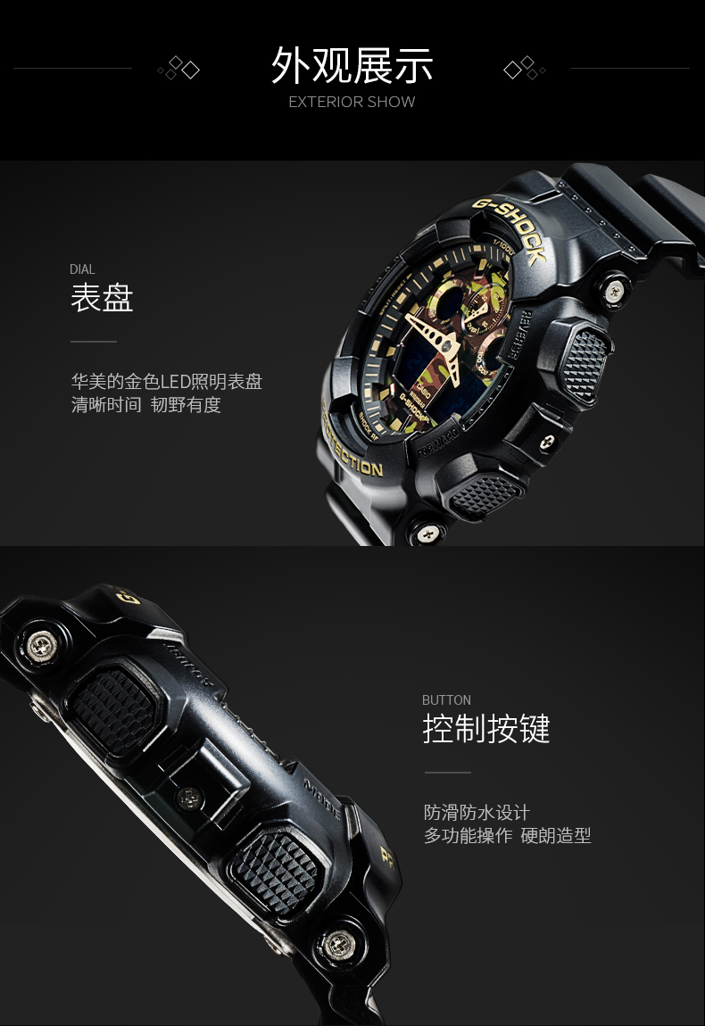 旗下的G-SHOCK系列,具有傲人的强悍耐用、防水等特点。SHOCK是打击/冲击的意思,G代表重力gravity。G-SHOCK被创造出来,源于一个简单的信念:创造一个永远不会摔坏的手表