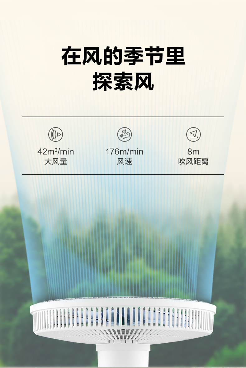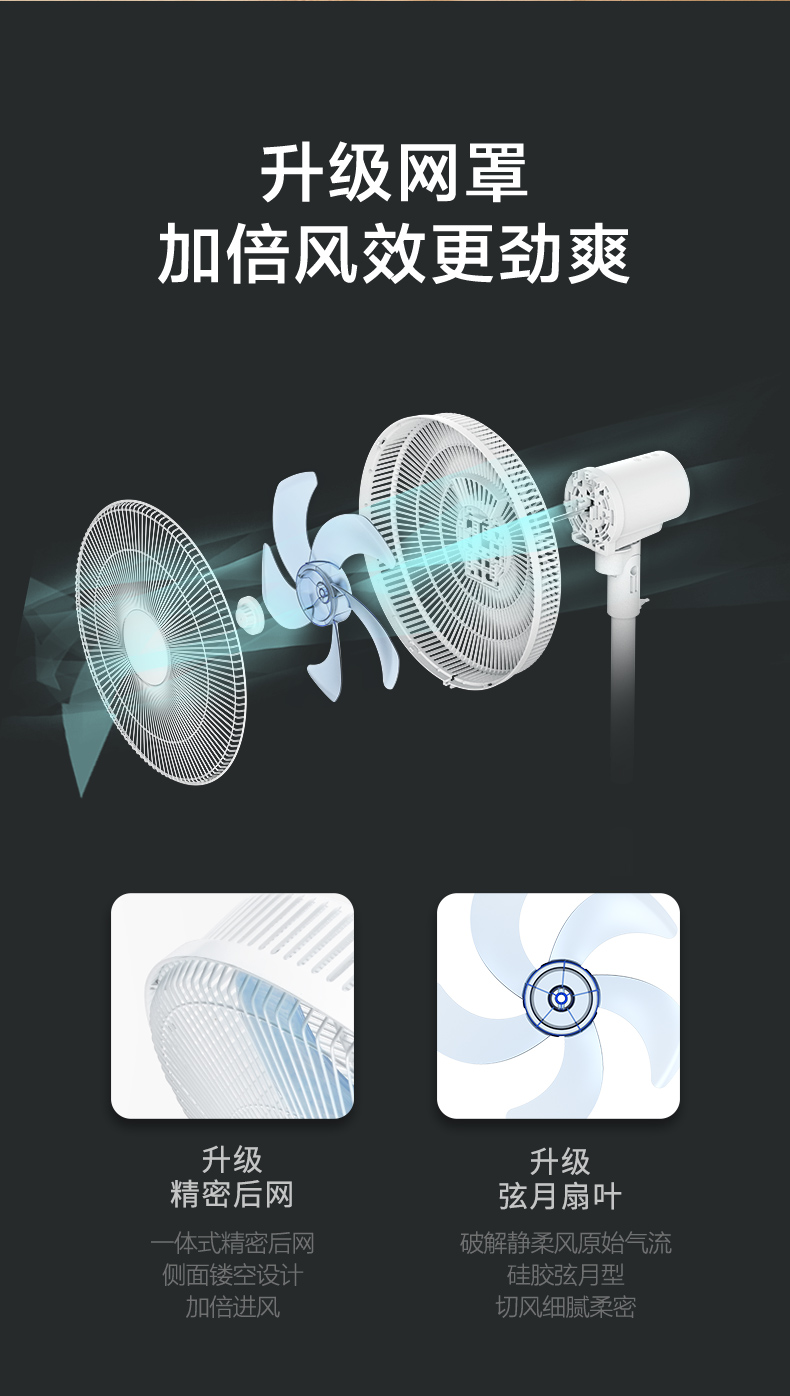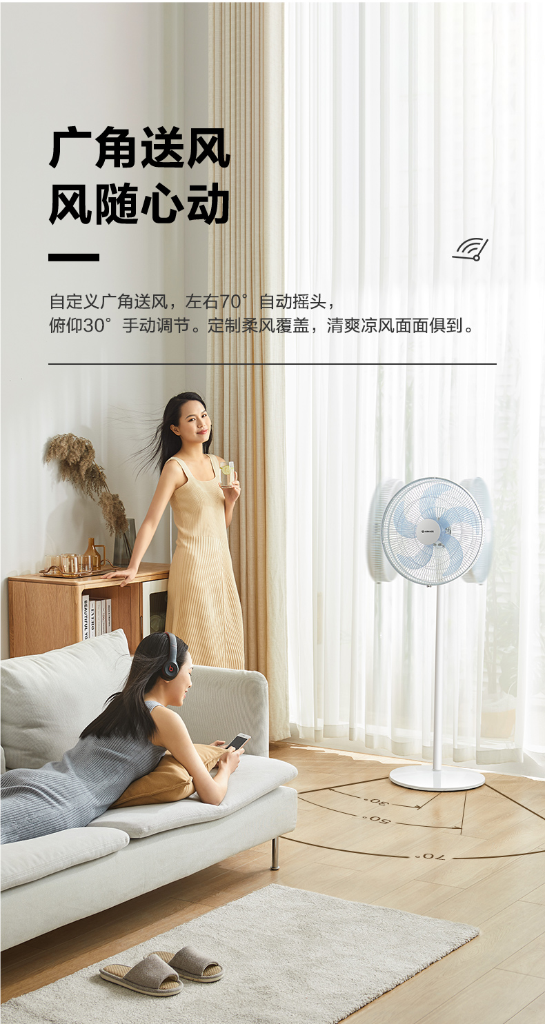 双段式144条反抛物线加速网罩,塑造风的形态送风平稳范围广,风感更柔和,最远10米远送风。70°左右广角送风,30°俯仰可调;
