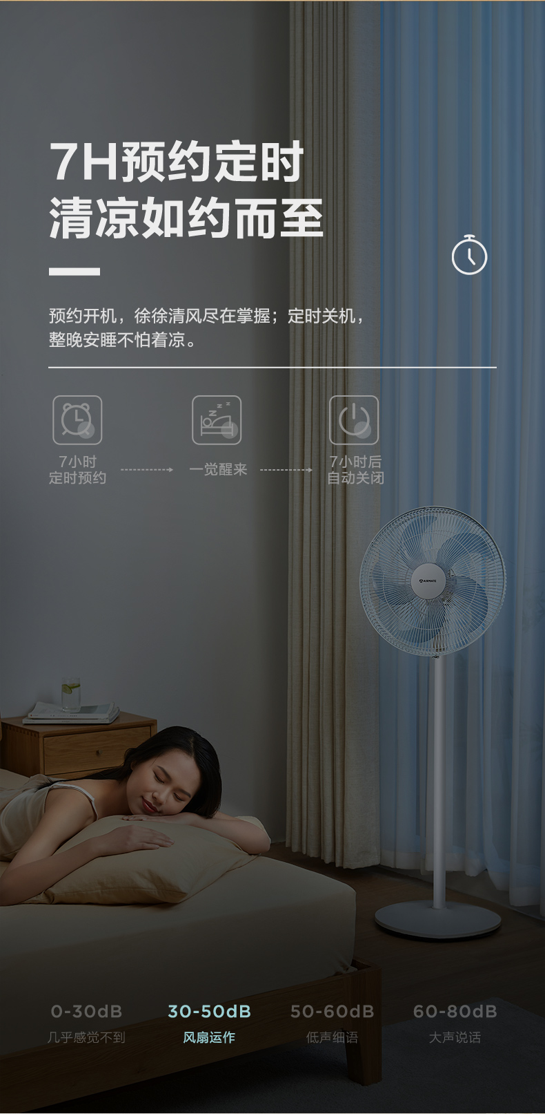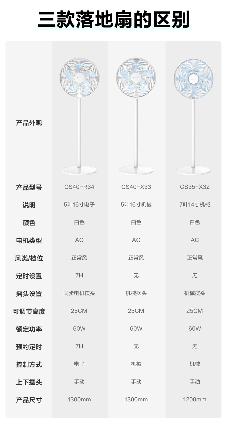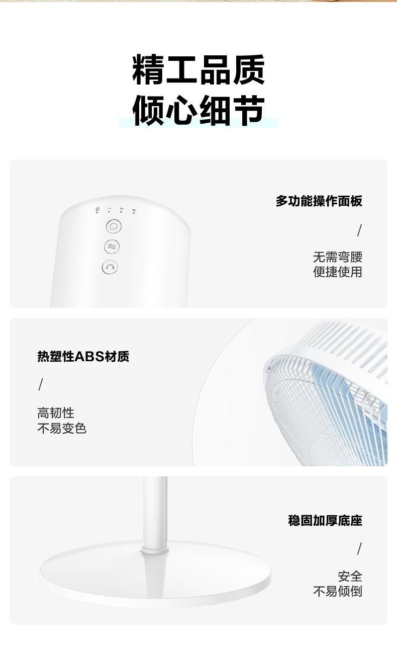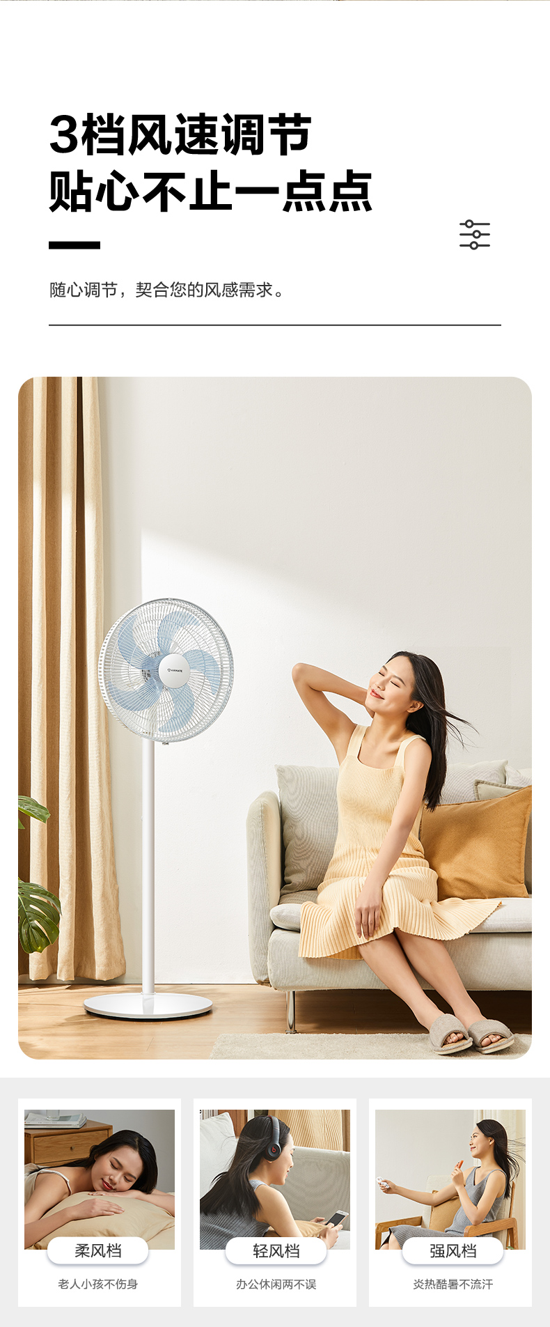 强中弱三档调节,大风强劲舒爽,小风轻柔细腻,还能7小时定时。稳固底座设计,防止倾倒。机械按钮非遥控器,需要注意。