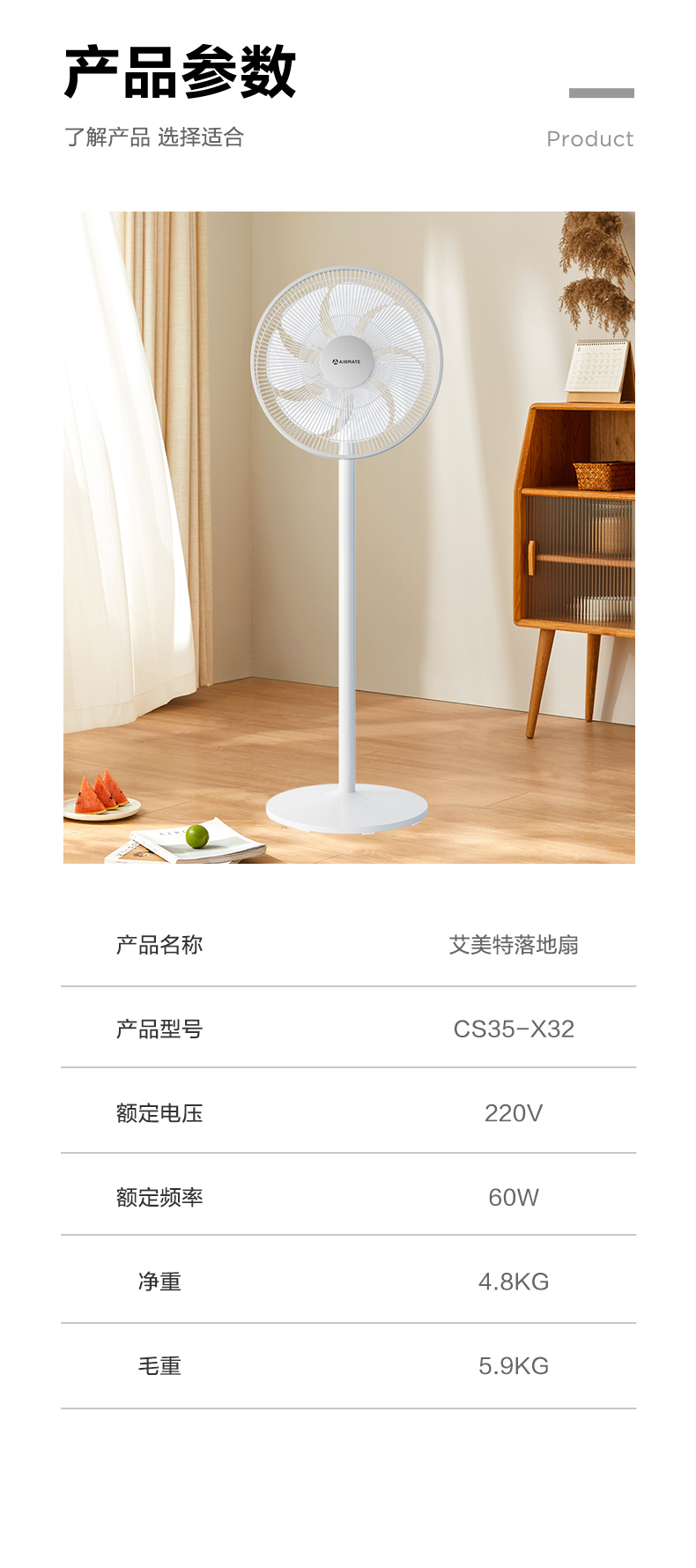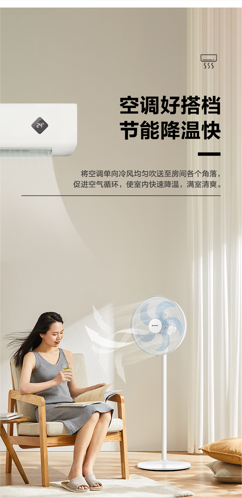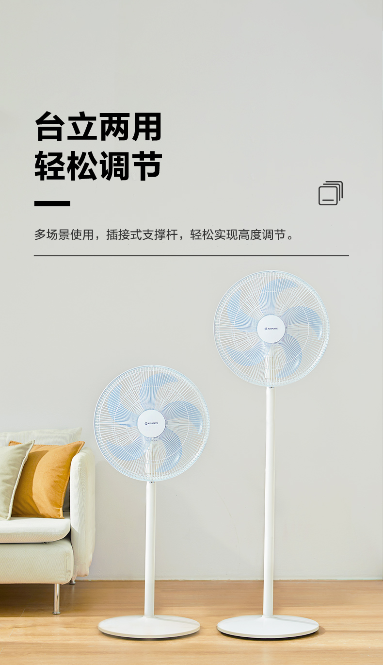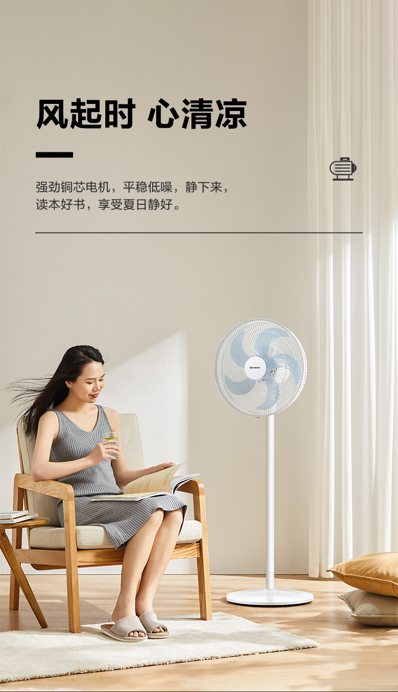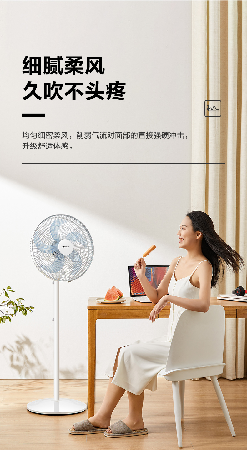 这款艾美特 CS35-X32立式电风扇,也可以当做循环扇使用。使用独家7片专利羽翼扇叶,比3叶和5叶的送风更均匀、稳定、柔和,送风量也更大。抛物线式中弧线设计,能减少气流损失,旋涡推送,柔化气流,送风更舒适。