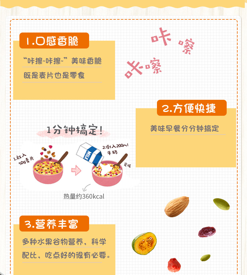 卡乐比的水果麦片非常好吃,口味丰富,可直接开袋干吃,一般作为早午餐泡牛奶、豆浆吃,泡在酸奶里也非常美味。这款麦片生产于日本北海道,非辐射污染区,同时许多原料还是进口的,安全上不用担心,国际官方旗舰店,来源渠道也有保障,可以放心食用。