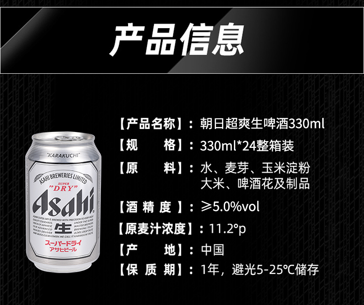 朝日啤酒株式会社成立于1889年,是日本有名的啤酒制造商之一,朝日啤酒出自日本酿造大师之手,从日本清酒干爽口感中获得启发而诞生,入口瞬间的畅快凛冽,以及后味干爽利落的口感,称其为“辛口感”。自1987年推出“Asahi Super Dry”以来,到如今人气依然并受到世界各地消费者的喜爱。