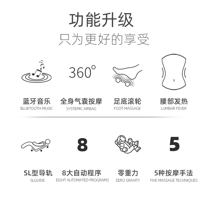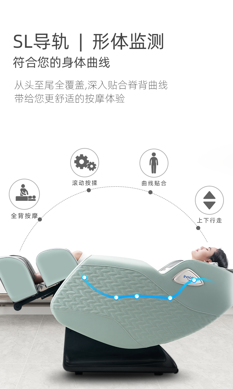SL型导轨则是导轨中最高级的形式,导轨长度长长,按摩区间能覆盖颈背腰臀,向下最低可达大腿根部,并且通过 S型变轨,贴合人体背部曲线 。