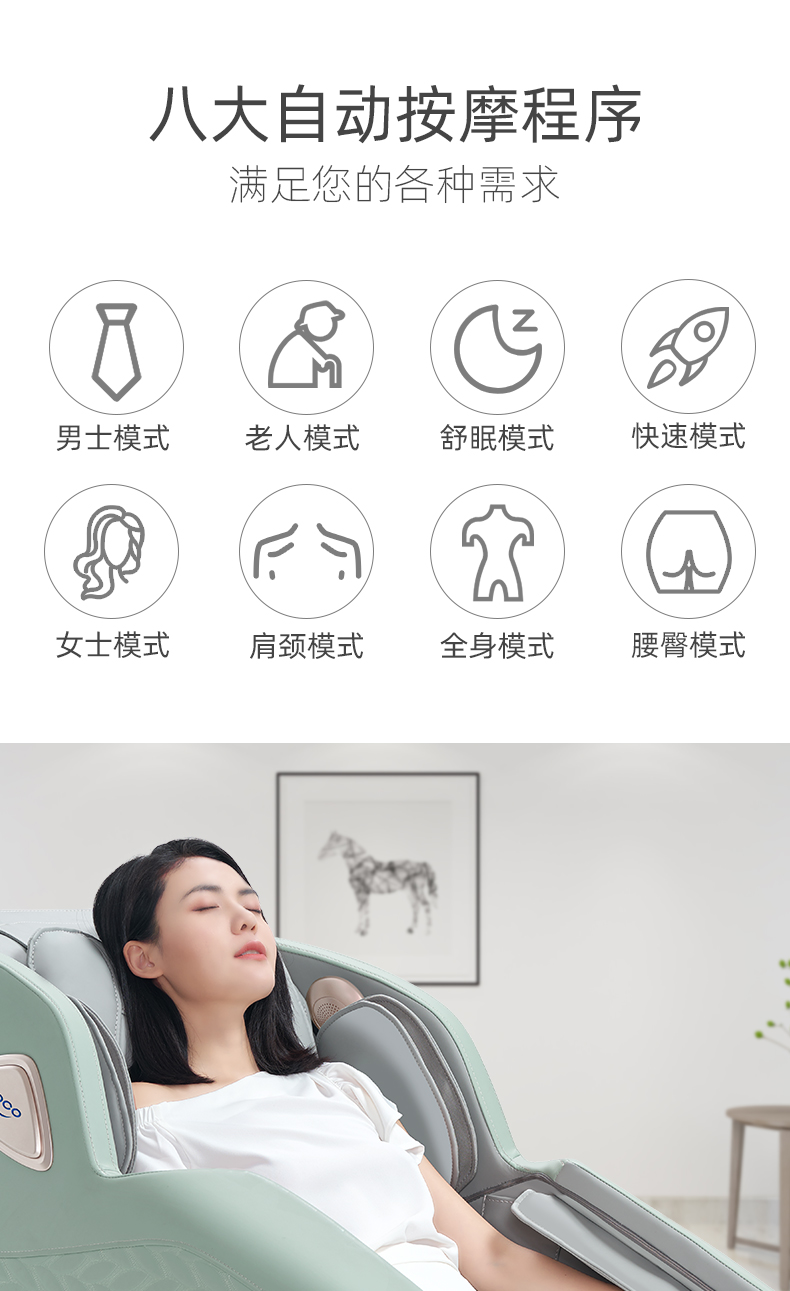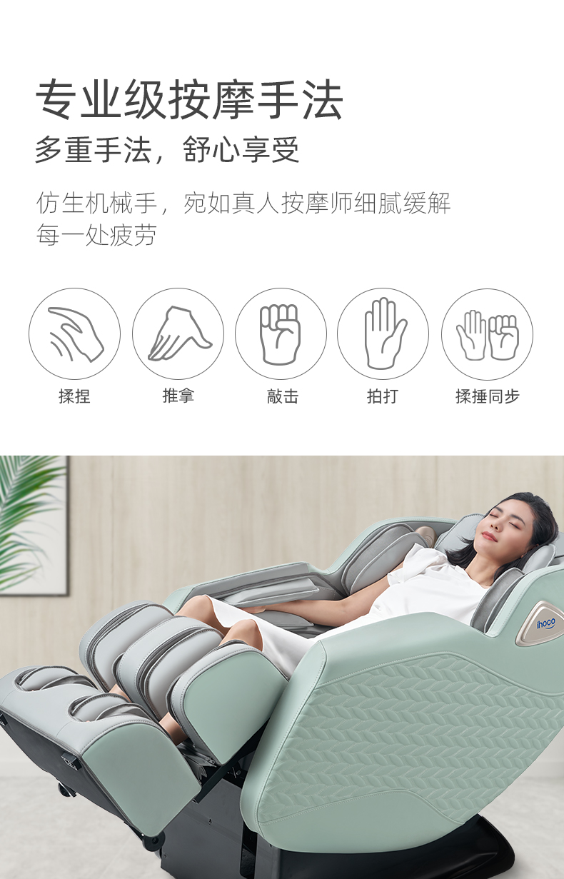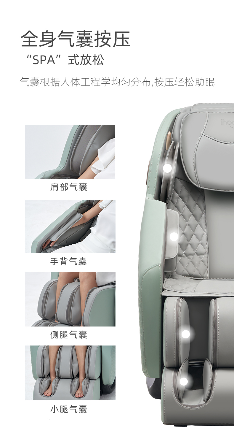ihoco是奥佳华集团旗下健康生活品牌,2019年也荣登国产按摩椅十大品牌,产品质量靠谱。此款按摩椅全身气囊包裹、8大自动程序:男士、女士、舒眠、快速、肩颈、全身、腰臀,可以说非常全面了。有人问为啥没有儿童,儿童骨骼没发育完成,理论上讲是不赞成儿童使用按摩椅的。