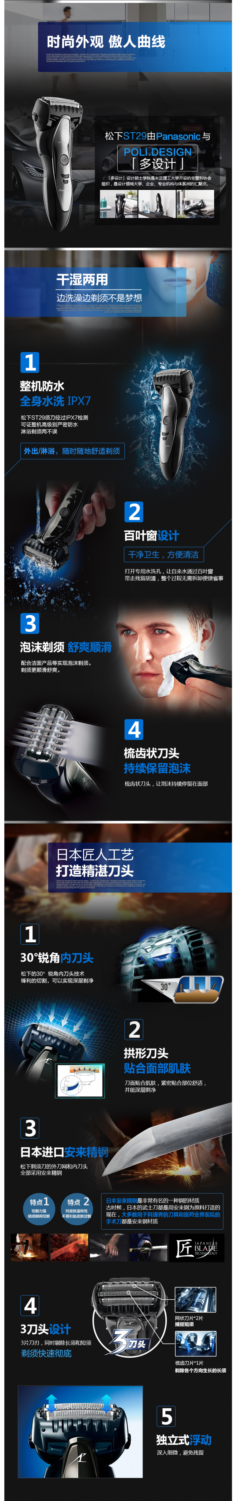 这款ST29电动剃须刀,属于旗下米兰系列产品线,一直是松下主力销量担当,在日亚非常畅销。机身是日本原装进口,由三枚垂直刀片组成独立式浮动三刀头,搭配高速磁悬浮马达每分钟13000转的转速,配合30度锐角刀头,浓密胡须也能轻动剃除。