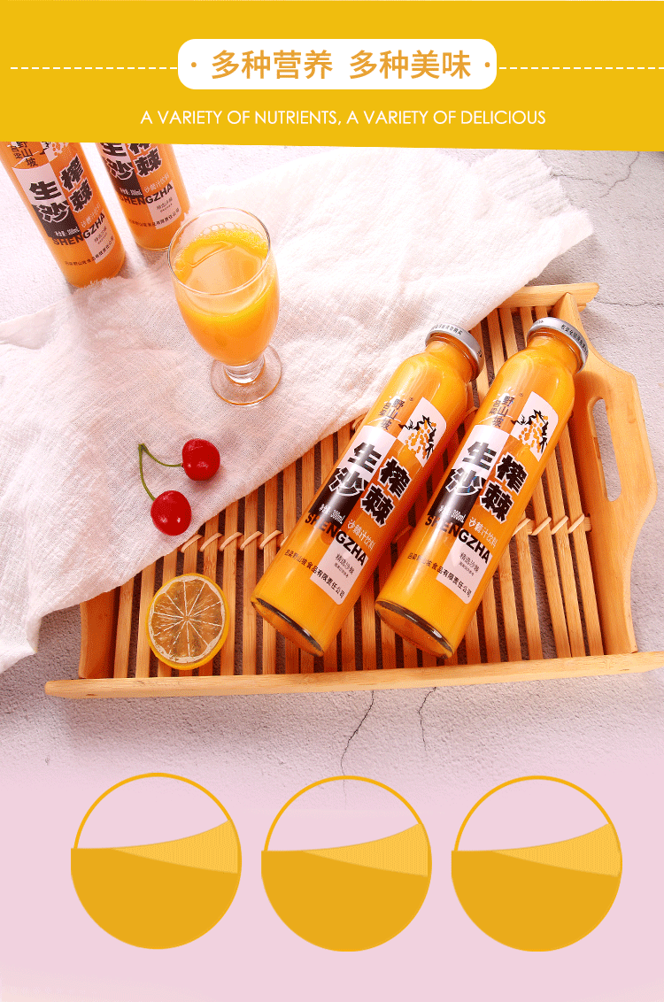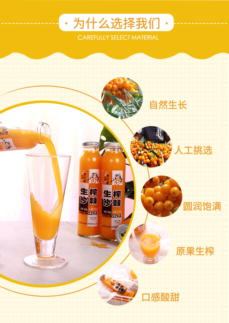 采用巴氏灭菌工艺制成,能充分保存沙棘果的独特风味;沙棘汁中超过20%的原浆含量,果油浓度很高,饮用后能即刻补充大量维C,对身体有益。