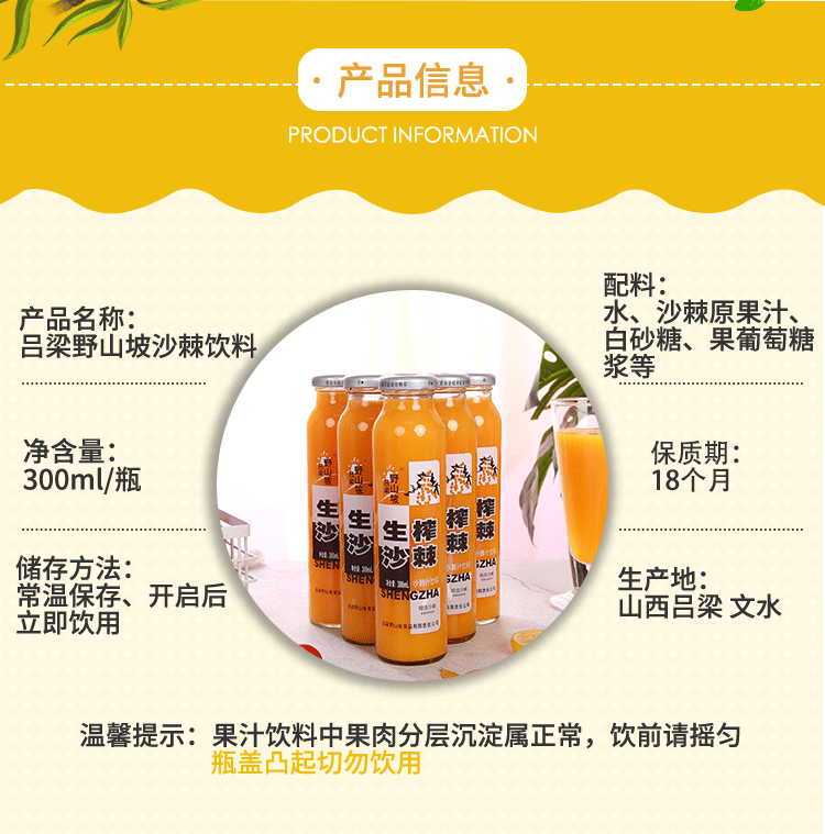 这款吕梁野山坡 野生沙棘果汁饮料,选用内山西庞泉沟自然保护区内的沙棘果作为原料,每一颗沙棘果都是颗粒饱满,色泽诱人。