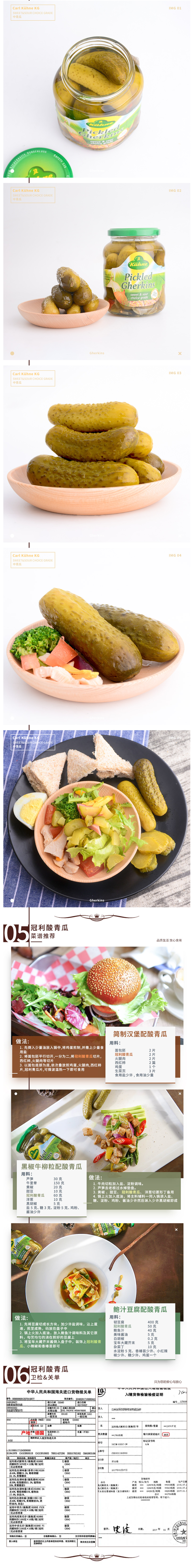 这款冠利俄式酸青瓜,德国原产,原料青瓜都来自有长久合作的农场,从种植到收获都有严格的控制,采摘洗净后立刻腌制,不二次腌制,保留了黄瓜的爽脆度,腌制所用的水、醋、糖和盐的配方是把由一代代传承下来,古老的味道。
