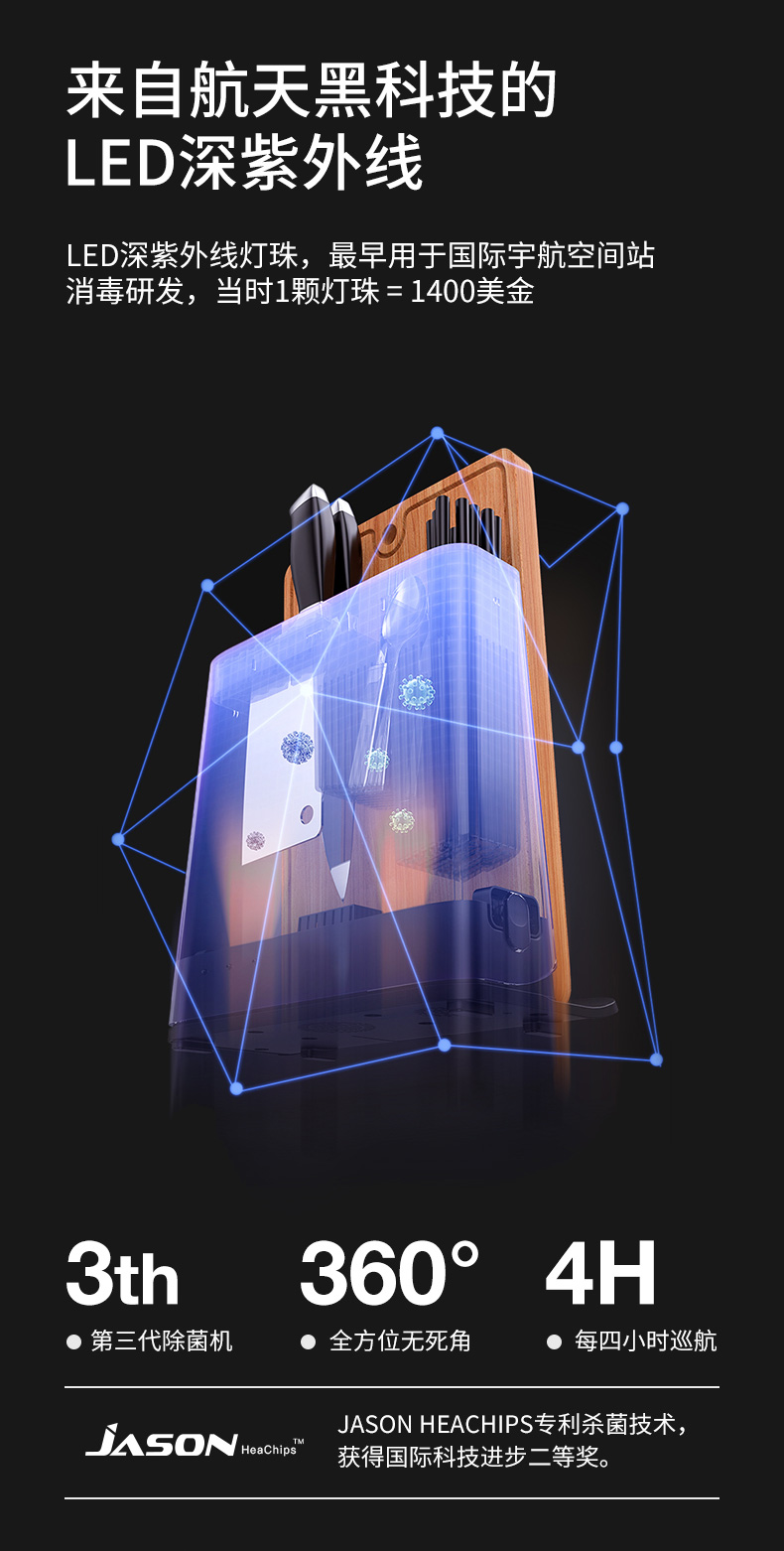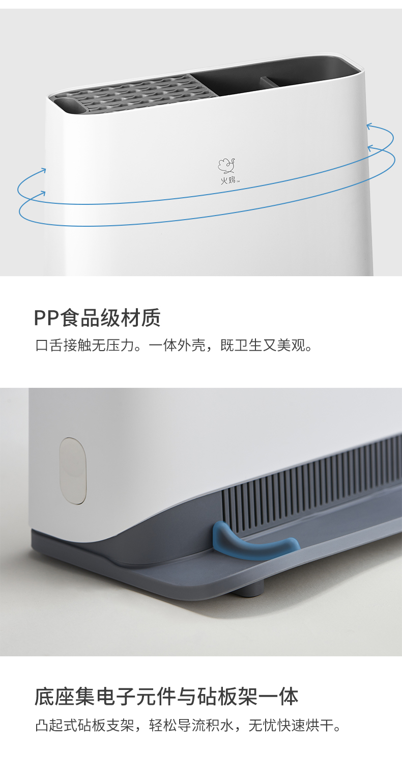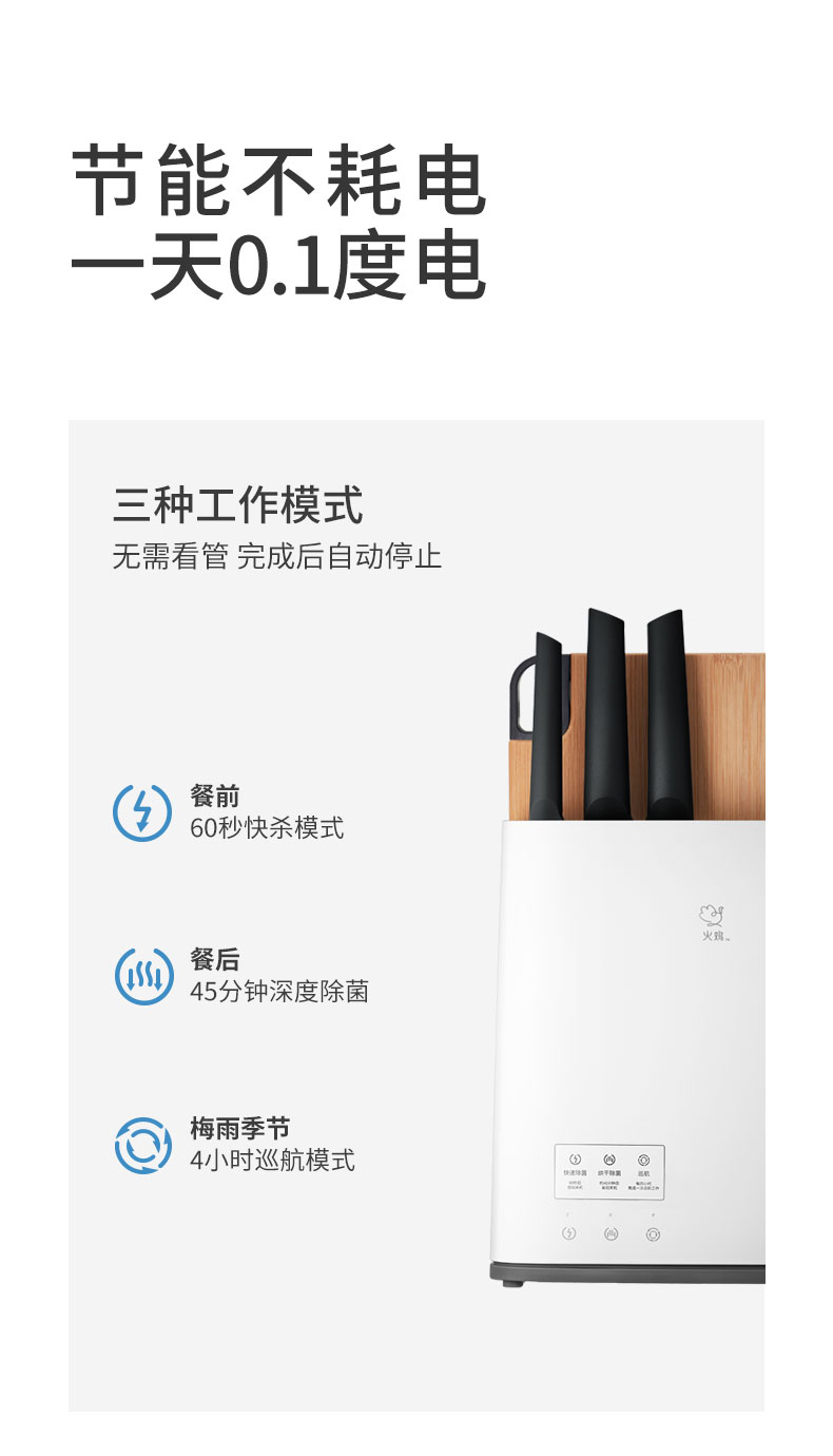 火鸡 第三代升级 KR61消毒刀架,JASON HEACHIPS专利杀菌技术,获得国际科技进步二等奖。具有2个紫外线光源+双热源,双重杀菌,有效解决刀、筷、砧板水渍残留,容易滋生细菌、警惕病从口入。