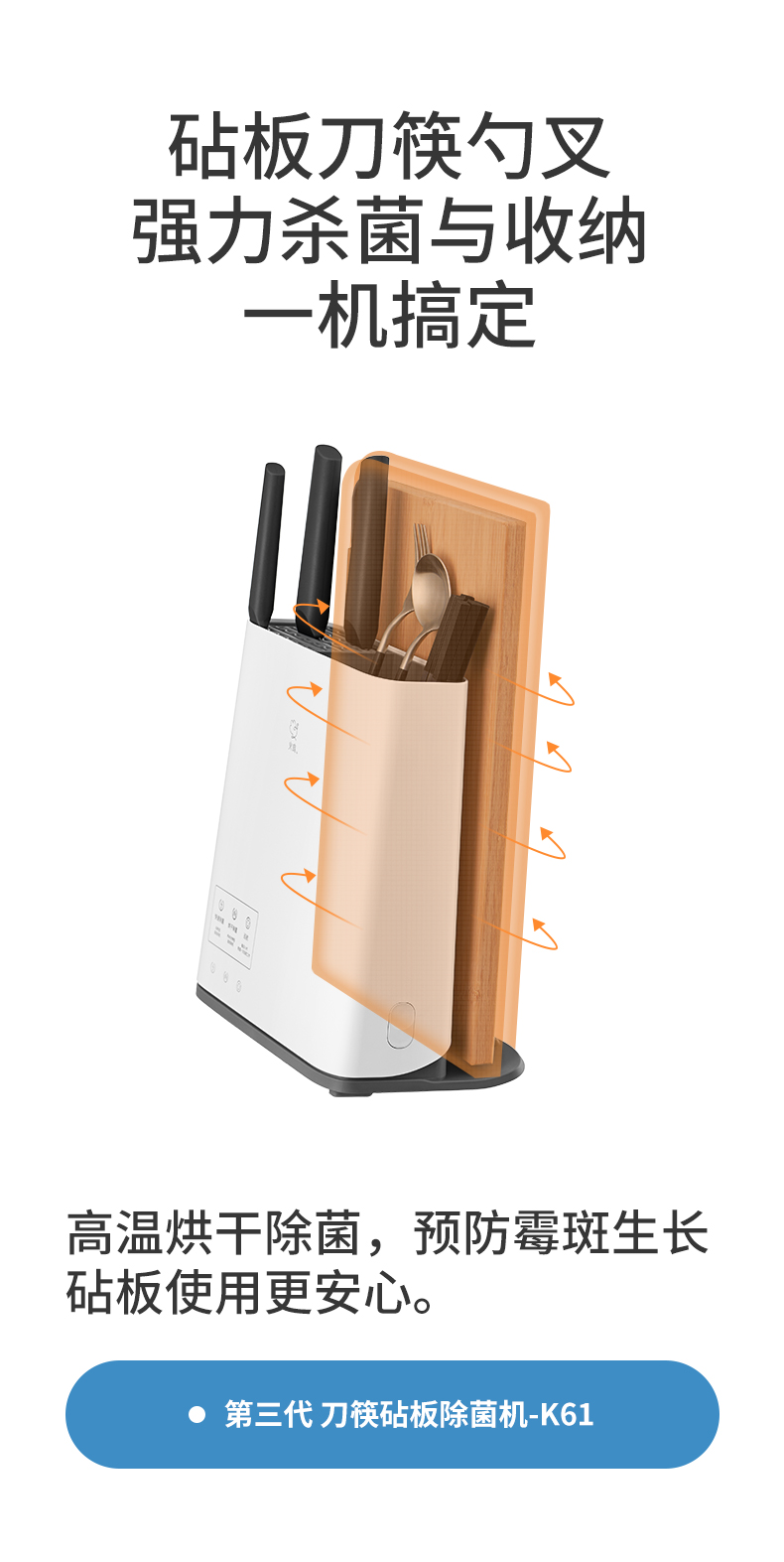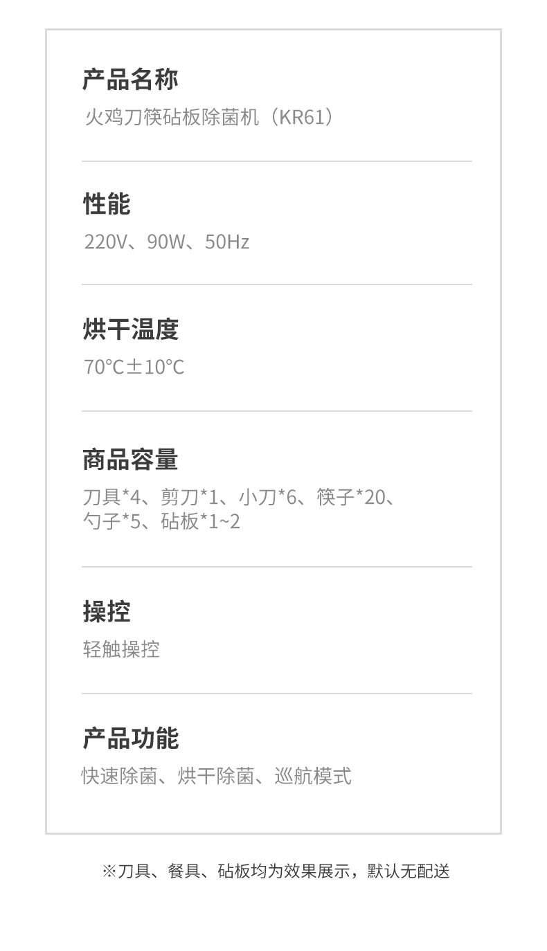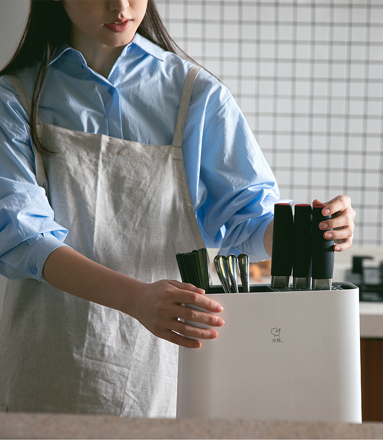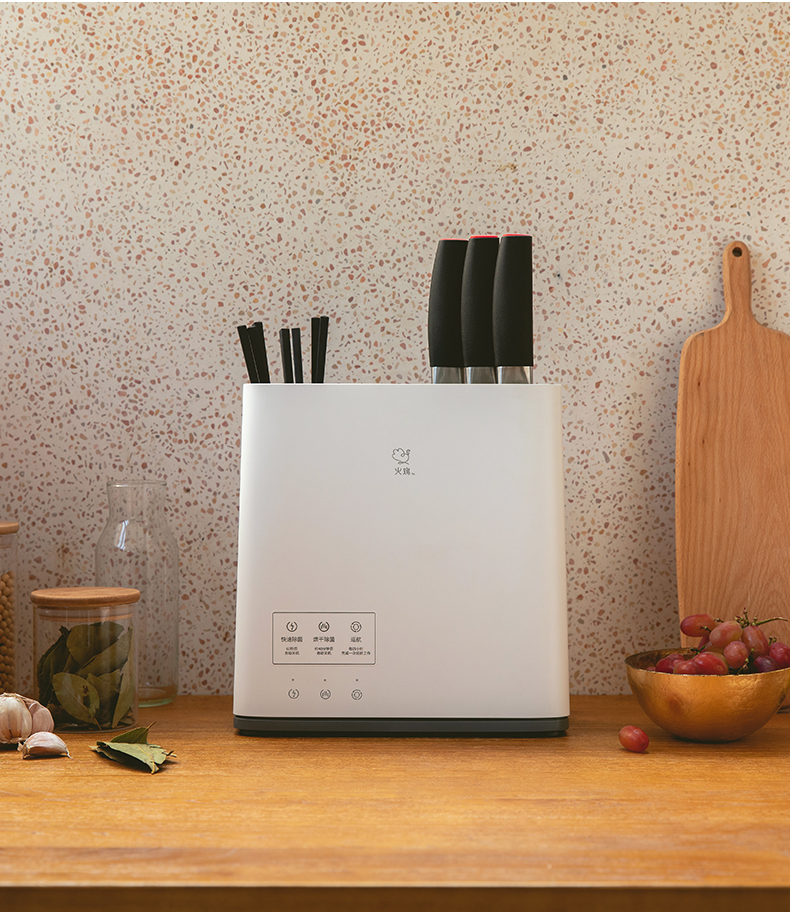 火鸡 第三代升级 KR61消毒刀架,JASON HEACHIPS专利杀菌技术,获得国际科技进步二等奖。具有2个紫外线光源+双热源,双重杀菌,有效解决刀、筷、砧板水渍残留,容易滋生细菌、警惕病从口入。